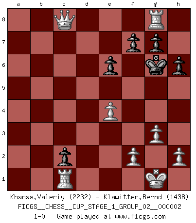 Last move : 1-0 2018 August 3 18:6:3 [Event "FICGS__CHESS__CUP_STAGE_1_GROUP_02__000002"] [Site "FICGS"] [Date "2018.07.02"] [Round "1"] [White "Khanas,Valeriy"] [Black "Klawitter,Bernd"] [Result "1-0"] [WhiteElo "2232"] [BlackElo "1438"] 1.d4 Nf6 2.c4 e6 3.Nf3 Bb4+ 4.Bd2 Bxd2+ 5.Qxd2 O-O 6.g3 c6 7.Bg2 d5 8.O-O dxc4 9.a4 a6 10.Ne5 Nfd7 11.Nxc4 b5 12.axb5 cxb5 13.Bxa8 bxc4 14.Na3 Nb6 15.Bf3 Bd7 16.Rfc1 Bb5 17.Nxb5 axb5 18.Ra5 Qd7 19.Qb4 Nc6 20.Bxc6 Qxc6 21.Qc5 Qxc5 22.dxc5 Nd5 23.Rxb5 c3 24.b4 Ra8 25.e4 Nc7 26.Rb7 Na6 27.c6 Nxb4 28.Rxb4 h6 29.c7 Rc8 30.Rb8 Kh7 31.Rxc8 Kg6 32.Rg8 c2 33.c8Q 1-0 Bogo-Indian defense Kingside Castling by player Black (move 5) Kingside Castling by player White (move 8) Promotion Queen by player White (move 33) Player White won this chess game. Follow this game move after move (download)Chess is a part of culture and if a culture is declining then Chess too will decline. (Mikhail Botvinnik) Das Schachspiel hat wie die Liebe, die Musik, die Fähigkeit, den Menschen glücklich zu machen. Ich habe ein leises Gefühl des Bedauerns für jeden, der das Schachspiel nicht kennt, so wie ich jeden bedaure, der die Liebe nicht kennt. (Siegbert Tarrasch) El sobresalir en el Ajedrez es un signo de una mente intrigante. (Sir Arthur Conan Doyle) Tous ces prétendus hommes politiques sont les pions, les Cavaliers, les Tours ou les Fous d'une partie d'échecs qui se jouera tant qu'un hasard ne renversera pas l'échiquier. (Honoré de Balzac) A specialist learns more and more about less and less until he knows everything about nothing. (Nicholas Murray Butler)