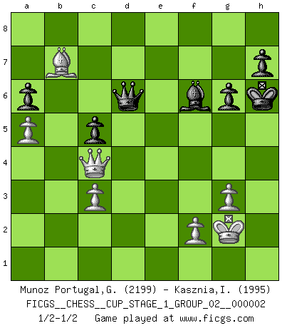 Last move : 1/2-1/2 2018 September 27 7:2:36 [Event "FICGS__CHESS__CUP_STAGE_1_GROUP_02__000002"] [Site "FICGS"] [Date "2018.07.02"] [Round "1"] [White "Munoz Portugal,Guillermo"] [Black "Kasznia,Ireneusz"] [Result "1/2-1/2"] [WhiteElo "2199"] [BlackElo "1995"] 1.e4 d6 2.d4 g6 3.Nc3 Bg7 4.Nf3 Nf6 5.Be2 O-O 6.O-O c5 7.d5 e6 8.dxe6 Bxe6 9.Bf4 d5 10.Nxd5 Nxd5 11.exd5 Qxd5 12.c3 Nd7 13.Ng5 Ne5 14.Nxe6 Qxe6 15.Re1 Qf5 16.Bg3 Rad8 17.Qb3 Qc8 18.Bxe5 Bxe5 19.g3 Bf6 20.Bf3 b6 21.Ra1d1 Rxd1 22.Rxd1 Rd8 23.Rxd8 Qxd8 24.Qa4 Qe7 25.h4 Bg7 26.Kg2 Bh6 27.Qd1 b5 28.a4 b4 29.h5 bxc3 30.bxc3 Bg7 31.Qd3 Bf6 32.a5 Kg7 33.Qc4 Qe5 34.h6 Kxh6 35.Qxf7 Qe7 36.Qb3 a6 37.Kf1 Be5 38.Qc4 Qd6 39.Bb7 Bf6 40.Kg2 Bd8 41.Qa4 Bf6 42.Qc4 1/2-1/2 King's pawn Opening Kingside Castling by player Black (move 5) Kingside Castling by player White (move 6) This chess game ended in a draw. Follow this game move after move (download)Every Chess master was once a beginner. (Chernev) Bis zum Jahr 1971 verlief in meiner Schachkariere alles glatt. Dieses dramatische Match [Fischer-Taimanov 6:0] machte mein Leben zur Hölle. (Mark Taimanov) Solo los afeminados hacen el Enroque. (Rob Sillars) Celui qui prend des risques peut perdre, celui qui n'en prend pas perd toujours. (Xavier Tartacover) When it is a question of money, everybody is of the same religion. (Voltaire)