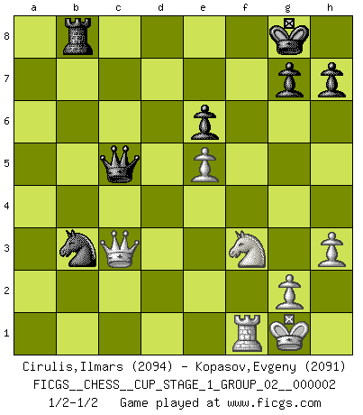 Last move : 1/2-1/2 2018 October 19 14:9:6 [Event "FICGS__CHESS__CUP_STAGE_1_GROUP_02__000002"] [Site "FICGS"] [Date "2018.07.02"] [Round "1"] [White "Cirulis,Ilmars"] [Black "Kopasov,Evgeny"] [Result "1/2-1/2"] [WhiteElo "2094"] [BlackElo "2091"] 1.b4 e5 2.a3 d5 3.Bb2 Bd6 4.Nf3 Qe7 5.c4 dxc4 6.e3 Nf6 7.Bxc4 O-O 8.d3 c6 9.O-O Nbd7 10.Nbd2 b5 11.Bb3 Bb7 12.Bc2 a5 13.bxa5 Rxa5 14.a4 Rfa8 15.axb5 Rxa1 16.Bxa1 cxb5 17.Qb1 Rc8 18.e4 b4 19.Bb3 Nc5 20.Bc4 Rb8 21.Ng5 Rf8 22.Ngf3 Rb8 23.Nh4 Bc8 24.Re1 b3 25.Nhf3 Bc7 26.d4 exd4 27.e5 Ng4 28.h3 Nxf2 29.Kxf2 Ba5 30.Bb2 Be6 31.Bxe6 fxe6 32.Kg1 Bc3 33.Rf1 Na4 34.Bxc3 dxc3 35.Nxb3 Nc5 36.Qa1 Nxb3 37.Qxc3 Qc5+ 1/2-1/2 Polish (Sokolsky) opening Kingside Castling by player Black (move 7) Kingside Castling by player White (move 9) This chess game ended in a draw. Follow this game move after move (download)The King is a fighting piece. Use it ! (Wilhelm Steinitz) Charakterschwächen offenbaren sich normalerweise während einer Schachpartie. (Garry Kasparov) Me siento como si fuera una pieza en una partida de Ajedrez, cuando mi oponente me indica: esa pieza no puede ser movida. (Soren Kierkegaard) Donnez-moi un Cavalier en 6e et je gagnerais toutes mes parties. (Steinitz) Industry executives and analysts often mistakenly talk about strategy as if it were some kind of chess match. But in chess, you have just two opponents, each with identical resources, and with luck playing a minimal role. The real world is much more like a poker game, with multiple players trying to make the best of whatever hand fortune has dealt them. In our industry, Bill Gates owns the table until someone proves otherwise. (David Moschella, 'Computerworld')