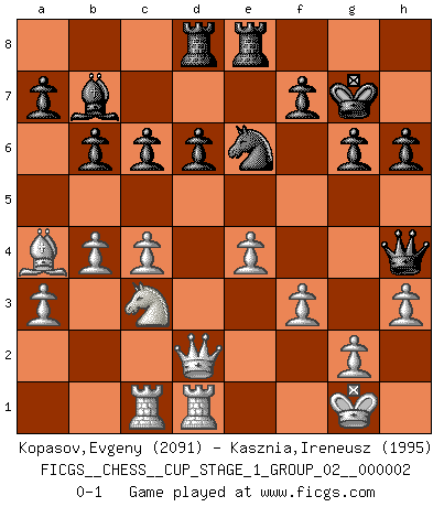 Last move : 0-1 2018 September 8 10:10:6 [Event "FICGS__CHESS__CUP_STAGE_1_GROUP_02__000002"] [Site "FICGS"] [Date "2018.07.02"] [Round "1"] [White "Kopasov,Evgeny"] [Black "Kasznia,Ireneusz"] [Result "0-1"] [WhiteElo "2091"] [BlackElo "1995"] 1.d4 Nf6 2.c4 g6 3.Nc3 Bg7 4.e4 d6 5.Nf3 O-O 6.Be2 e5 7.O-O exd4 8.Nxd4 Nc6 9.Be3 Nxd4 10.Bxd4 Re8 11.f3 b6 12.Qd2 Bb7 13.Rae1 c6 14.Bd1 Qc7 15.Bc2 Rad8 16.Kh1 h6 17.a3 Ba6 18.Bd3 Qe7 19.b4 Rc8 20.Rc1 Bb7 21.Rfd1 Rcd8 22.Bc2 Nd7 23.Bxg7 Kxg7 24.Kg1 Qh4 25.h3 Nf8 26.Ba4 Ne6 0-1 King's Indian : Orthodox variation Kingside Castling by player Black (move 5) Kingside Castling by player White (move 7) Player Black won this chess game. Follow this game move after move (download)You sit at the board and suddenly your heart leaps. Your hand trembles to pick up the piece and move it. But what Chess teaches you is that you must sit there calmly and think about whether it's really a good idea and whether there are other better ideas. (Stanley Kubrick) Die Auseinandersetzung mit Karpow war politisch geprägt. Er stand für das kommunistische System, wurde von dessen Repräsentanten gehätschelt. Ich war der Oppositionelle. Jeder Schachweltmeister spiegelt auch die gesellschaftlichen Verhältnisse wider. Kramnik steht für die Börsen-Generation des Neuen Markts, ideologiefrei, zahlenfixiert. (Garry Kasparov) Es el objetivo de la escuela moderna no tratar cada posición de acuerdo a una regla general, sino de acuerdo al principio inherente en la posición. (Richard Reti) Les Echecs mettent en conflit, non pas deux intelligences, mais deux volontés. (Lasker) Memory is a crazy woman that hoards colored rags and throws away food. (Austin O'Malley)