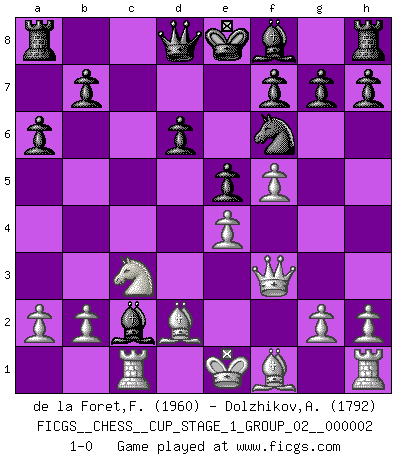 Last move : 1-0 2018 September 2 10:33:28 [Event "FICGS__CHESS__CUP_STAGE_1_GROUP_02__000002"] [Site "FICGS"] [Date "2018.07.02"] [Round "1"] [White "de la Foret,Fred"] [Black "Dolzhikov,Aleksandr"] [Result "1-0"] [WhiteElo "1960"] [BlackElo "1792"] 1.e4 c5 2.Nf3 d6 3.d4 cxd4 4.Nxd4 Nf6 5.Nc3 a6 6.Be3 e5 7.Nb3 Be6 8.f4 Ng4 9.Bd2 Nd7 10.f5 Bxb3 11.Qxg4 Nf6 12.Qf3 Bxc2 13.Rc1 1-0 Sicilian : Najdorf, Byrne (English) attack Player White won this chess game. Follow this game move after move (download)Chess, like love, like music, has the power to make people happy. (Siegbert Tarrasch) Schach ist ein Reich, wo sich die menschliche Phantasie frei entfalten kann. (David Bronstein) Fischer es una tragedia del Ajedrez Americano a la par con Morphy y Pillsbury. (Mig Greengard) Les échecs, c'est la lutte contre l'erreur. (Johannes Zukertort) A shortcut is the longest distance between two points. (Don Groves)