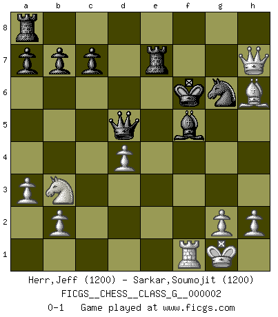 Last move : 0-1 2006 September 9 18:17:51 [Event "FICGS__CHESS__CLASS_G__000002"] [Site "FICGS"] [Date "2006.06.07"] [Round "1"] [White "Herr,Jeff"] [Black "Sarkar,Soumojit"] [Result "0-1"] [WhiteElo "1200"] [BlackElo "1200"] 1.d4 Nf6 2.c4 e6 3.Nc3 Bb4 4.Qc2 Nc6 5.Nf3 d5 6.cxd5 exd5 7.a3 Bd6 8.e3 Bd7 9.Bd3 O-O 10.O-O Ne7 11.e4 Bg4 12.e5 Ng6 13.Nd2 Nh5 14.exd6 Qxd6 15.f3 Bd7 16.Nb3 Nhf4 17.Bxg6 Nxg6 18.f4 Rfe8 19.f5 Ne7 20.f6 Ng6 21.fxg7 Kxg7 22.Qd2 Nh4 23.Qg5+ Ng6 24.Qh6+ Kg8 25.Rxf7 Kxf7 26.Qxh7+ Kf6 27.Bh6 Re7 28.Rf1+ Bf5 29.Nxd5+ Qxd5 0-1 Nimzo-Indian : Classical, 4...Nc6 Kingside Castling by player Black (move 9) Kingside Castling by player White (move 10) Player Black won this chess game. Follow this game move after move (download)When you don't know what to do, wait for your opponent to get an idea - it's sure to be wrong. (Tarrasch) Smyslow ist ein Beweis dafür, dass ich noch zehn Jahre spielen kann! [der 75 jährige über den 85 jährigen] (Viktor Kortschnoi) El Ajedrez es una guerra en un tablero. El objetivo es aplastar la mente del oponente. (Bobby Fischer) Shah mat. Le roi est mort. Cri de fierté d'un joueur venant de terrasser son adversaire, courtoisement, sans effusion de sang. In my experience, there's no such thing as luck. (Obi-Wan Kenobi in Star Wars ep.4)