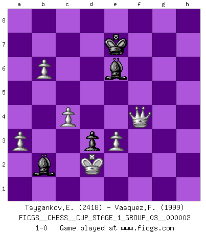 Last move : 1-0 2018 October 16 7:8:57 [Event "FICGS__CHESS__CUP_STAGE_1_GROUP_03__000002"] [Site "FICGS"] [Date "2018.07.02"] [Round "1"] [White "Tsygankov,Evgeny"] [Black "Vasquez,Fernando"] [Result "1-0"] [WhiteElo "2418"] [BlackElo "1999"] 1.d4 Nf6 2.c4 e6 3.Nf3 d5 4.Nc3 Nc6 5.a3 Bd6 6.Bg5 Be7 7.e3 O-O 8.Qc2 h6 9.h4 Re8 10.O-O-O Ng4 11.g3 hxg5 12.hxg5 g6 13.Bh3 e5 14.dxe5 d4 15.Ne4 Bf5 16.e6 Bf8 17.Bxg4 Bxg4 18.Nf6+ Qxf6 19.gxf6 Bxf3 20.exf7+ Kxf7 21.Rh7+ Kxf6 22.g4 Bxg4 23.f3 Bxf3 24.Rg1 g5 25.Qf2 Ne5 26.Qg3 d3 27.Qxg5+ Ke6 28.Qf4 Rad8 29.Kd2 Rd7 30.Rg5 Rxh7 31.Rxe5+ Kd7 32.Qf5+ Kd8 33.Rxe8+ Kxe8 34.Qxh7 Bc6 35.Qxc7 Be7 36.Qb8+ Kf7 37.Qxa7 Bf6 38.b4 Kg6 39.b5 Bg2 40.Qb6 Be4 41.Qe6 Bf5 42.Qg8+ Bg7 43.Qb8 Bb2 44.Qxb7 Kf6 45.Qc6+ Ke7 46.Qc5+ Kf6 47.Qd6+ Be6 48.Qf4+ Ke7 49.b6 1-0 Queen's pawn game Kingside Castling by player Black (move 7) Queenside Castling by player White (move 10) 10 pieces endgame at move 44 : White KQPPPP , Black KBBP WHITE : King + 1 Queen 4 Pawns BLACK : King + 2 Bishops 1 Pawn Player White won this chess game. Follow this game move after move (download)Fischer prefers to enter Chess history alone. (Miguel Najdorf) Wenn es im Universum noch irgendwo intelligente Lebewesen gibt, dann kennen sie Go. (Emanuel Lasker) Personalmente, yo prefiero mirar hacia el futuro en donde un programa de computadora gane el título mundial de Ajedrez. La humanidad necesita una lección de humildad. (Richard Dawkings) On est toujours la mazette de quelqu'un d'autre. (Anonyme) Crush them ! Make them suffer ! (General Grievous in Star Wars ep.3)