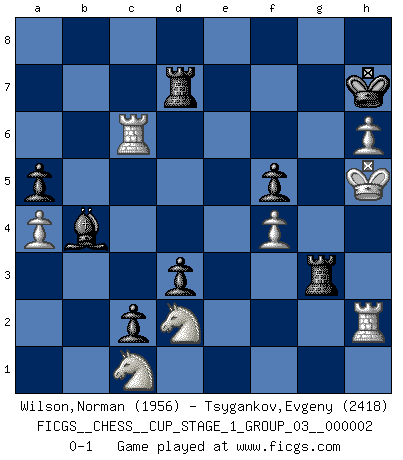 Last move : 0-1 2018 September 11 20:12:0 [Event "FICGS__CHESS__CUP_STAGE_1_GROUP_03__000002"] [Site "FICGS"] [Date "2018.07.02"] [Round "1"] [White "Wilson,Norman"] [Black "Tsygankov,Evgeny"] [Result "0-1"] [WhiteElo "1956"] [BlackElo "2418"] 1.d4 Nf6 2.c4 g6 3.Nc3 Bg7 4.e4 O-O 5.f3 d6 6.Be3 c5 7.Nge2 Nc6 8.d5 Ne5 9.Ng3 h5 10.Be2 h4 11.Nf1 e6 12.f4 Nxc4 13.Bxc4 b5 14.Bxb5 exd5 15.e5 Bg4 16.Be2 Bxe2 17.Qxe2 dxe5 18.fxe5 Nd7 19.Bf4 g5 20.Bd2 d4 21.Ne4 Qe7 22.Bxg5 Qxe5 23.Nfd2 Rae8 24.Kf1 Re6 25.Re1 Qb8 26.Kg1 Qe8 27.Qb5 d3 28.Qb3 Bd4+ 29.Kf1 Nb6 30.Bxh4 c4 31.Qd1 Bxb2 32.Nd6 Qb8 33.Nf5 Qf4+ 34.Qf3 Qxf3+ 35.Nxf3 c3 36.N5d4 Rg6 37.Bg5 c2 38.h4 Rd6 39.Nb3 Rc8 40.g3 a5 41.Rh2 Nc4 42.Rf2 f6 43.Bf4 Rd5 44.Nc1 Ne5 45.Kg2 Bc3 46.Nd2 Ng6 47.Re3 Nxf4+ 48.gxf4 Bb2 49.Rf1 Bc3 50.Rf2 Rcd8 51.Kf3 R5d7 52.a4 Kh7 53.h5 f5 54.Re1 Rb8 55.Na2 Bh8 56.h6 Rb2 57.Nc1 Rb4 58.Kg3 Bd4 59.Rh2 Bc3 60.Re6 Re4 61.Rc6 Re3+ 62.Kh4 Bb4 63.Kh5 Rg3 0-1 King's Indian : 4.e4 Kingside Castling by player Black (move 4) Player Black won this chess game. Follow this game move after move (download)The older I grow, the more I value Pawns. (Keres) Ich verstehe mehr vom Schach als irgendein anderer lebender Meister. (José Raúl Capablanca) Fischer es una tragedia del Ajedrez Americano a la par con Morphy y Pillsbury. (Mig Greengard) Dieu déplace le joueur, et celui-ci la pièce. Quel Dieu derrière Dieu commence donc la trame ? Arturo Perez-Reverte (prix de littérature policière 1993). I don't know, I don't care, and it doesn't make any difference. (Albert Einstein)