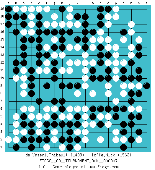 Last move : 1-0 2007 November 19 16:55:11 [Event "FICGS__GO__TOURNAMENT_DAN__000007"] [Site "FICGS"] [Date "2007.05.11"] [Round "1"] [Black "de Vassal,Thibault"] [White "Ioffe,Nick"] [Result "1-0"] [Rating 1 "1409"] [Rating 2 "1563"] 1.q16 d17 2.q4 o17 3.d4 r14 4.c15 d12 5.e15 g17 6.f16 f17 7.f13 r17 8.k4 r6 9.q10 q8 10.r5 o8 11.o10 m8 12.m10 k8 13.r12 r16 14.q13 c6 15.c5 d6 16.g4 g6 17.e12 e11 18.d11 c11 19.d10 c10 20.c12 d13 21.c13 d14 22.c14 f11 23.d9 c9 24.d8 c8 25.n4 c3 26.d3 d2 27.e2 b2 28.d1 b5 29.q6 s6 30.l16 o15 31.l14 h11 32.h9 l10 33.f9 l12 34.j13 j11 35.n14 o14 36.s13 k17 37.j16 j17 38.l17 r3 39.s5 p2 40.q3 q2 41.s3 s2 42.r4 n2 43.r2 l2 44.k2 m4 45.m5 l4 46.n6 l5 47.k5 l6 48.r8 r9 49.r7 q9 50.r10 s9 51.q14 q15 52.c17 d16 53.d15 c16 54.b16 o12 55.s11 p11 56.q11 p10 57.c18 d18 58.h16 h17 59.k18 j18 60.l18 g18 61.n12 m12 62.n13 n11 63.o13 p14 64.o11 p12 65.m11 p13 66.c4 b4 67.j9 o9 68.n10 l11 69.k9 l9 70.s14 s15 71.s8 o5 72.o6 o4 73.p5 n5 74.h6 f5 75.e7 e5 76.f4 h5 77.g5 j6 78.h7 j5 79.j4 g15 80.g16 h13 81.h14 f12 82.e13 g13 83.g14 f14 84.e14 k14 85.k13 l13 86.l15 j14 87.h15 j12 88.n18 o18 89.g7 k6 90.h4 e4 91.c2 b3 92.d19 e19 93.e18 f19 94.h19 j19 95.e17 c19 96.k15 d19 97.e16 b17 98.b18 a18 99.a17 b19 100.a19 m14 101.a18 m15 102.q1 k1 103.j2 e3 104.f3 g2 105.f2 d5 106.d2 f6 107.m16 n16 108.n17 n15 109.g10 f1 110.j1 k3 111.j3 l3 112.g12 k12 113.g11 h1 114.h2 g3 115.b11 b10 116.b12 q12 117.s10 r13 118.o19 p19 119.n19 p18 120.t9 p7 121.p6 p3 122.b1 a2 123.m6 1-0 Here are the names of the openings (joseki) played in the four corners : Corner q16 : q16 o17 Hoshi (Hwajeom, Seongjeom, Xingwei`) 4-4 Point. The star or hoshi (4-4) point, emphasizing influence at the potential expense of territory. Ikken Kakari (Hankan Keolch'im, Yi Gua`jiao~, 1-Space Low Approach). White 2 is the standard approach move to the 4-4. Corner d16 : d17 c15 Komoku (Somok, Xiao~mu`) 3-4 Point. The komoku (3-4) point is the traditional corner enclosure move.. Ikken Kakari (Hankan Keolch'im, Yi Gua`jiao~, 1-Space Low Pincer). The small knight move is the basic approach move to the 3-4 point stone. It has been continually used for over four centuries. There are limitless variations, with new moves constantly being discovered. Black 2 opens the door to a treaure store of joseki. Corner q4 : q4 r6 Hoshi (Hwajeom, Seongjeom, Xingwei`) 4-4 Point. The star or hoshi (4-4) point, emphasizing influence at the potential expense of territory. Ikken Kakari (Hankan Keolch'im, Yi Gua`jiao~, 1-Space Low Approach). White 2 is the standard approach move to the 4-4. Corner d4 : d4 c6 Hoshi (Hwajeom, Seongjeom, Xingwei`) 4-4 Point. The star or hoshi (4-4) point, emphasizing influence at the potential expense of territory. Ikken Kakari (Hankan Keolch'im, Yi Gua`jiao~, 1-Space Low Approach). White 2 is the standard approach move to the 4-4. Player Black won this Go (weiqi, baduk) game. Follow this game move after move (download)The monkey jump is worth eight points. (Anonymous) Do you know these so called Volunteers don't even get paid! (Simpsons)