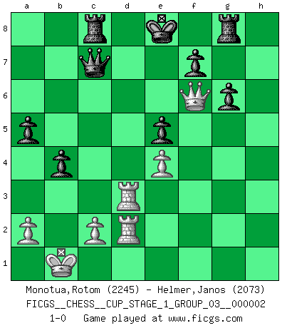 Last move : 1-0 2018 September 16 14:50:6 [Event "FICGS__CHESS__CUP_STAGE_1_GROUP_03__000002"] [Site "FICGS"] [Date "2018.07.02"] [Round "1"] [White "Monotua,Rotom"] [Black "Helmer,Janos"] [Result "1-0"] [WhiteElo "2245"] [BlackElo "2073"] 1.e4 c5 2.Nf3 d6 3.d4 cxd4 4.Nxd4 Nf6 5.Nc3 a6 6.Be3 e5 7.Nb3 Be6 8.h3 Nbd7 9.g4 h6 10.Qd2 b5 11.O-O-O Nb6 12.f4 Qc7 13.Qf2 Rb8 14.fxe5 dxe5 15.Nc5 Bc8 16.Bd3 Be7 17.Kb1 b4 18.N3a4 Nxa4 19.Nxa4 Be6 20.b3 Qc6 21.Qg3 Nd7 22.Rd2 Rc8 23.Rhd1 Rc7 24.h4 O-O 25.Rg2 a5 26.Qf3 Bxh4 27.g5 hxg5 28.Bxg5 Bxg5 29.Rxg5 g6 30.Rh1 Kg7 31.Qh5 R7c8 32.Qh6+ Kf6 33.Qh4 Kg7 34.Rh5 Rg8 35.Rh7+ Kf8 36.Qg5 Ke8 37.Rh8 Rf8 38.R8h2 Rg8 39.Rf1 Rf8 40.Rd1 Rg8 41.Nb2 Nc5 42.Nc4 Nxd3 43.Rxd3 Bxc4 44.bxc4 Qxc4 45.Rhd2 Qc7 46.Qf6 1-0 Sicilian : Najdorf, Byrne (English) attack Queenside Castling by player White (move 11) Kingside Castling by player Black (move 24) Player White won this chess game. Follow this game move after move (download)During a Chess competition a Chessmaster should be a combination of a beast of prey and a monk. (Alexander Alekhine) Ich hatte meine größten Erfolge, als ich 47 Jahre alt war. Kasparow war noch nicht mal 42 und hat das Schach schon im Stich gelassen. (Viktor Kortschnoi) Los tropiezos estan todos ahí en el tablero, esperando que se cometan. (Savielly Tartakover) Les Echecs, c'est l'art de la guerre sans les charniers, c'est la résurrection des morts tombés au champ d'honneur, l'espoir perpétuel, la suprématie de l'intelligence sur la force, la culture de l'esprit. (F. Szpiner) You can't play chess if you're groggy from pills. (Anatoly Karpov)