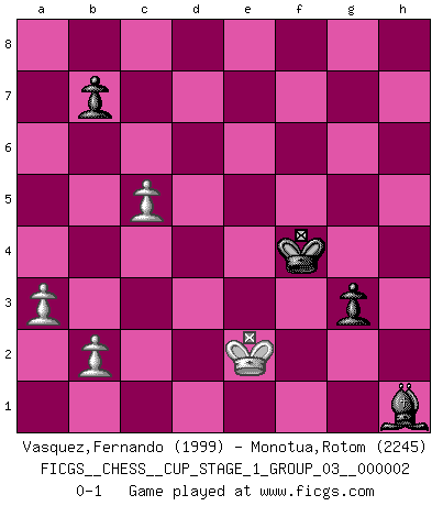 Last move : 0-1 2018 October 28 15:26:16 [Event "FICGS__CHESS__CUP_STAGE_1_GROUP_03__000002"] [Site "FICGS"] [Date "2018.07.02"] [Round "1"] [White "Vasquez,Fernando"] [Black "Monotua,Rotom"] [Result "0-1"] [WhiteElo "1999"] [BlackElo "2245"] 1.e4 c5 2.c3 Nf6 3.e5 Nd5 4.d4 cxd4 5.Nf3 d6 6.Qxd4 e6 7.Nbd2 Nc6 8.Bb5 Bd7 9.Bxc6 Bxc6 10.Nc4 f6 11.Nxd6+ Bxd6 12.exd6 e5 13.Qc5 Qb6 14.Qxb6 axb6 15.O-O Kd7 16.Nh4 g6 17.c4 Nb4 18.Be3 Nc2 19.Rac1 Nxe3 20.fxe3 Ke6 21.a3 Rhd8 22.Rfd1 Rd7 23.Nf3 Rad8 24.Rc3 g5 25.Kf2 g4 26.Ne1 Be4 27.Ke2 Rxd6 28.Rxd6+ Rxd6 29.Rb3 f5 30.Kf1 Kf6 31.Rb4 h5 32.Ke2 h4 33.Rb5 Bc6 34.Rb3 f4 35.Kf1 Rd2 36.exf4 exf4 37.Rxb6 Kf5 38.Rb3 g3 39.hxg3 fxg3 40.c5 Rf2+ 41.Kg1 Re2 42.Kf1 Rxe1+ 43.Kxe1 Bxg2 44.Re3 Kf4 45.Re7 h3 46.Rf7+ Ke5 47.Re7+ Kf6 48.Rh7 h2 49.Ke2 h1Q 50.Rxh1 Bxh1 51.Kf1 Ke5 52.Ke2 Kf4 0-1 Sicilian : Alapin's variation (2.c3) Kingside Castling by player White (move 15) 10 pieces endgame at move 43 : White KRPPP , Black KBPPP WHITE : King + 1 Rook 3 Pawns BLACK : King + 1 Bishop 3 Pawns Promotion Queen by player Black (move 49) 9 pieces endgame at move 50 : White KRPPP , Black KBPP WHITE : King + 1 Rook 3 Pawns BLACK : King + 1 Bishop 2 Pawns 8 pieces endgame at move 50 : White KPPP , Black KBPP WHITE : King + 3 Pawns BLACK : King + 1 Bishop 2 Pawns Player Black won this chess game. Follow this game move after move (download)You may learn much more from a game you lose than from a game you win. You will have to lose hundreds of games before becoming a good player. (Jose Raul Capablanca) Wenn du gegen Bobby spielst, ist es keine Frage von gewinnen oder verlieren. Es ist eine Frage des Überlebens. (Boris Vassilievich Spassky) Existen dos clases de sacrificios: los correctos y los míos. (Mikhail Tal) Toutes choses étant égales, c'est la conviction qui gagne. Alliée à une volonté de vaincre, elle sert de détonateur, suscite des idées, disperse les doutes et aide à penser clairement. (Robert Fischer) A journey of a thousand sites begins with a single click. (Author unknown)