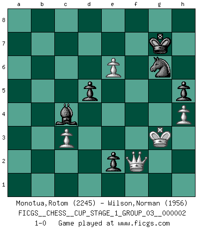 Last move : 1-0 2018 August 18 12:9:27 [Event "FICGS__CHESS__CUP_STAGE_1_GROUP_03__000002"] [Site "FICGS"] [Date "2018.07.02"] [Round "1"] [White "Monotua,Rotom"] [Black "Wilson,Norman"] [Result "1-0"] [WhiteElo "2245"] [BlackElo "1956"] 1.Nf3 Nf6 2.g3 d5 3.Bg2 g6 4.d4 Bg7 5.O-O O-O 6.c4 dxc4 7.Nc3 c6 8.e4 Nbd7 9.Qe2 Nb6 10.Rd1 h6 11.h3 Ne8 12.Ne5 a5 13.Be3 Nd6 14.f4 Kh7 15.a4 Qc7 16.g4 e6 17.Qf2 f6 18.Nf3 f5 19.e5 Nf7 20.Kh1 Bd7 21.Rg1 Nd5 22.gxf5 gxf5 23.Bf1 Nxe3 24.Qxe3 b5 25.Be2 Rg8 26.Ne4 Raf8 27.Nh4 Nd8 28.Bh5 fxe4 29.Rg2 Rf5 30.Bg6+ Kh8 31.Rag1 Bc8 32.axb5 Qe7 33.Qg3 Qc7 34.b6 Qd7 35.Bxf5 exf5 36.Ng6+ Kh7 37.Nf8+ Rxf8 38.Qxg7+ Qxg7 39.Rxg7+ Kh8 40.Rc7 Ba6 41.R1g7 Ne6 42.Rh7+ Kg8 43.Ra7 e3 44.Kg1 c3 45.bxc3 Bc4 46.b7 Kxh7 47.b8Q Kh8 48.Qb7 Rg8+ 49.Kh2 Rg7 50.Ra8+ Kh7 51.Qb1 Nxf4 52.Qxf5+ Ng6 53.h4 e2 54.Qe4 h5 55.e6 Re7 56.Rxa5 Kh6 57.Qe3+ Kg7 58.d5 cxd5 59.Ra7 Rxa7 60.Qxa7+ Kg8 61.Qf7+ Kh8 62.Qf2 Kg7 63.Kg3 1-0 Reti Opening Kingside Castling by player White (move 5) Kingside Castling by player Black (move 5) Promotion Queen by player White (move 47) Player White won this chess game. Follow this game move after move (download)I have always a slight feeling of pity for the man who has no knowledge of Chess. (Siegbert Tarrasch) Das ganze Leben mit einer Ehefrau ist wie ein Endspiel mit ungleichfarbigen Läufern. (Viktor Kortschnoi) Es muy difícil jugar en contra de la teoría de Einstein. - en su primera derrota en contra de Fischer (Mikhail Tal) Je ne crois pas en la psychologie, je crois aux bons coups. (Robert Fischer) Never was anything great achieved without danger. (Niccolo Machiavelli)