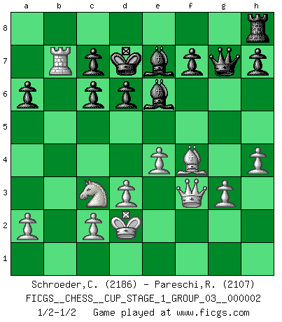 Last move : 1/2-1/2 2018 August 9 20:12:13 [Event "FICGS__CHESS__CUP_STAGE_1_GROUP_03__000002"] [Site "FICGS"] [Date "2018.07.02"] [Round "1"] [White "Schroeder,Christoph"] [Black "Pareschi,Remo"] [Result "1/2-1/2"] [WhiteElo "2186"] [BlackElo "2107"] 1.e4 e5 2.f4 exf4 3.Nf3 g5 4.h4 g4 5.Ne5 d6 6.Nxg4 Nf6 7.Nxf6+ Qxf6 8.Nc3 Qg7 9.Qf3 Nc6 10.Bb5 a6 11.Bxc6+ bxc6 12.d3 Rb8 13.Bxf4 Rxb2 14.Kd2 Be7 15.g3 Be6 16.Rhb1 Rxb1 17.Rxb1 Kd7 18.Rb7 1/2-1/2 KGA : Kieseritsky, Kolisch defense This chess game ended in a draw. Follow this game move after move (download)Bobby just drops the pieces and they fall on the right squares. (Miguel Najdorf) Frage: Gibt es etwas was Sie mehr lieben als Autobahnen ohne Tempobegrenzungen? - Antwort: Deutsche Frauen ohne Tempobegrenzungen. (Loek van Wely) Jugadores de primera clase pierden en contra de jugadores de segunda clase porque los jugadores de segunda clase a veces juegan una partida de primer clase. (Siegbert Tarrasch) Plusieurs personnes se sont demandées comment Tal faisait pour gagner... En fait, c'est très simple ! Il met ses pièces au centre de l'échiquier et les sacrifie quelque part ! (David Bronstein) The problem with troubleshooting is that trouble shoots back. (Anonymous)
