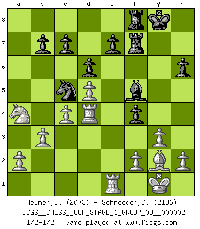 Last move : 1/2-1/2 2018 July 13 15:31:14 [Event "FICGS__CHESS__CUP_STAGE_1_GROUP_03__000002"] [Site "FICGS"] [Date "2018.07.02"] [Round "1"] [White "Helmer,Janos"] [Black "Schroeder,Christoph"] [Result "1/2-1/2"] [WhiteElo "2073"] [BlackElo "2186"] 1.Nf3 f5 2.d4 Nf6 3.g3 g6 4.Bg2 Bg7 5.O-O O-O 6.c4 d6 7.Nc3 Qe8 8.d5 a5 9.Be3 h6 10.Qd2 g5 11.Rad1 Na6 12.Bd4 Qg6 13.e3 Ne4 14.Qc1 Nac5 15.Bxg7 Qxg7 16.Nd4 Nxc3 17.Qxc3 f4 18.exf4 gxf4 19.Rfe1 Rf7 20.Nb5 Qxc3 21.Nxc3 Bf5 22.Rd4 Raf8 23.b3 a4 24.Nxa4 1/2-1/2 Reti v Dutch Kingside Castling by player White (move 5) Kingside Castling by player Black (move 5) This chess game ended in a draw. Follow this game move after move (download)You can only get good at Chess if you love the game. (Bobby Fischer) Heutzutage gewinnt im Turnier nicht derjenige Spieler, der weitreichende Pläne entwirft, sondern einfach jener, der Zug um Zug kämpft. (David Bronstein) Fischer es el jugador mas fuerte del mundo. De hecho, el jugador mas fuerte que jamas haya existido. (Larry Evans) Echiquier : carré parfait, comme la Jérusalem nouvelle décrite par l'auteur de l'Apocalypse, huit cases sur huit, exaltation du chiffre 4, symbole du cosmos aux quatre horizons... où le noir et le blanc, l'ombre et la lumière, le mal et le bien s'entremêlent et se conjuguent. (Robert Couffignal, Le Gambit du poète) My poor ole parrot... Is not in the circulation of displays ....poo hoo hoo :) (Wayne Lowrance's enigma)
