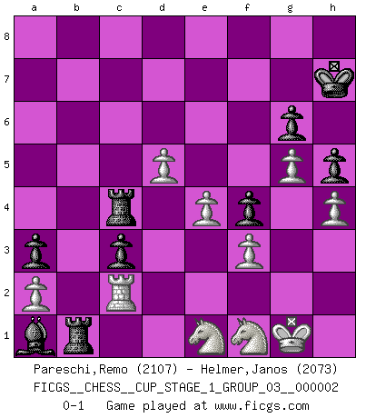 Last move : 0-1 2018 December 31 15:43:53 [Event "FICGS__CHESS__CUP_STAGE_1_GROUP_03__000002"] [Site "FICGS"] [Date "2018.07.02"] [Round "1"] [White "Pareschi,Remo"] [Black "Helmer,Janos"] [Result "0-1"] [WhiteElo "2107"] [BlackElo "2073"] 1.d4 Nf6 2.c4 g6 3.Nc3 Bg7 4.e4 d6 5.Nf3 O-O 6.Be2 e5 7.d5 a5 8.Bg5 h6 9.Be3 Ng4 10.Bd2 Na6 11.h3 Nf6 12.g4 Nc5 13.Qc2 c6 14.Be3 a4 15.Bxc5 dxc5 16.Qd3 cxd5 17.cxd5 Bd7 18.Nd2 Qe7 19.O-O Rfb8 20.Qe3 b5 21.b3 Ne8 22.Kg2 h5 23.Rfc1 Kh7 24.g5 f5 25.h4 f4 26.Qd3 Nd6 27.Qc2 a3 28.f3 Rb7 29.Rab1 Bf8 30.Qd1 Qd8 31.Qe1 Qa5 32.Nd1 Rc8 33.Nf2 c4 34.bxc4 Rbc7 35.Nd3 bxc4 36.Nxe5 Bb5 37.Rc2 Bg7 38.Rxb5 Qxb5 39.Nc6 Qa4 40.Qc1 Bb2 41.Qd1 c3 42.Nf1 Nb5 43.Bxb5 Qxb5 44.Qd4 Rg8 45.Ne5 R8g7 46.Kf2 Rc8 47.Kg2 Ba1 48.Qd1 Qa4 49.Nd3 Qd4 50.Qe2 Rf7 51.Ne1 Rb7 52.Qa6 R8c7 53.Qd3 Qxd3 54.Nxd3 Rb2 55.Ne1 Rc4 56.Kg1 Rb1 0-1 This chess game has been lost on time (started : 2018.07.02 2:46:10) King's Indian : Petrosian system, Stein variation Kingside Castling by player Black (move 5) Kingside Castling by player White (move 19) Player Black won this chess game. Follow this game move after move (download)It is the aim of the modern school, not to treat every position according to one general law, but according to the principle inherent in the position. (Richard Reti) Alles was ich jemals tun will ist Schach spielen. (Robert James Fischer) No existe un remordimiento como el remordimiento del Ajedrez. (H. G. Wells) L'ordinateur a tué l'originalité. Il n'y a plus guère d'aventures sur l'échiquier. (Jacob Murray) Philosophers use a language that is already deformed as though by shoes that are too tight. (Ludwig Wittgenstein)