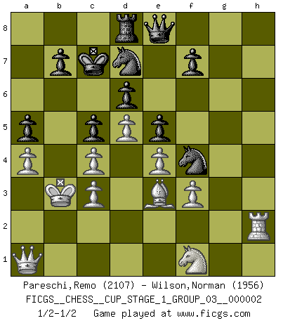 Last move : 1/2-1/2 2018 September 21 12:46:25 [Event "FICGS__CHESS__CUP_STAGE_1_GROUP_03__000002"] [Site "FICGS"] [Date "2018.07.02"] [Round "1"] [White "Pareschi,Remo"] [Black "Wilson,Norman"] [Result "1/2-1/2"] [WhiteElo "2107"] [BlackElo "1956"] 1.d4 Nf6 2.c4 e6 3.Nc3 Bb4 4.Bg5 c5 5.d5 Bxc3+ 6.bxc3 h6 7.Bh4 d6 8.e3 Qe7 9.Bd3 Nbd7 10.Nf3 e5 11.Nd2 g5 12.Bg3 Kd8 13.h4 Rg8 14.hxg5 hxg5 15.Qb3 Qf8 16.O-O-O Kc7 17.a4 a5 18.Bc2 Ne8 19.Bf5 Ra6 20.Rdf1 Nb6 21.Bxc8 Kxc8 22.e4 Nf6 23.Kb2 Kb8 24.f3 Ka7 25.Ka3 Kb8 26.Rfg1 Nfd7 27.Qc2 Qe8 28.Rh6 g4 29.Bf2 Kc7 30.Kb3 gxf3 31.gxf3 Rxg1 32.Bxg1 Nf8 33.Qa2 Ng6 34.Qa3 Nd7 35.Qa1 Rb6+ 36.Ka3 Nf4 37.Rh2 Ra6 38.Be3 Ra8 39.Kb3 Rd8 40.Nf1 1/2-1/2 Nimzo-Indian : Leningrad variation Queenside Castling by player White (move 16) This chess game ended in a draw. Follow this game move after move (download)Fischer is the strongest player in the world. In fact, the strongest player who ever lived. (Larry Evans) Schach ist Leben. (Robert James Fischer) Bobby solo arroja las piezas y solas caen en las casillas correctas. (Miguel Najdorf ) Les Echecs sont et restent toujours un combat, un combat intégral comme la boxe, la lutte ou un autre sport, et où il doit y avoir un vainqueur et un vaincu. (Joseph Emil Diemer) Always remember that you are unique; just like everyone else. (Unknown)