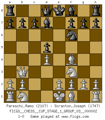 Last move : 1-0 2018 September 9 0:11:21 [Event "FICGS__CHESS__CUP_STAGE_1_GROUP_03__000002"] [Site "FICGS"] [Date "2018.07.02"] [Round "1"] [White "Pareschi,Remo"] [Black "Scranton,Joseph"] [Result "1-0"] [WhiteElo "2107"] [BlackElo "1747"] 1.d4 Nc6 2.Nf3 d5 3.c4 Nf6 4.cxd5 Nb4 5.Qa4+ Bd7 6.Qxb4 e6 7.Qb3 exd5 8.Bf4 1-0 This chess game has been lost on time (started : 2018.07.02 2:46:10) Queen's pawn : Lundin (Kevitz-Mikenas) defense Player White won this chess game. Follow this game move after move (download)We cannot resist the fascination of sacrifice, since a passion for sacrifices is part of a Chessplayer's nature. (Rudolf Spielman) Schach ist das Spiel, das die Verrückten gesund hält. (Albert Einstein) El Ajedrez es un mar en el cual un mosquito puede beber y un elefante puede bañarse. (Refrán Hindú) À la honte des hommes, on sait que les lois du jeu sont les seules qui soient partout justes, claires, inviolables et exécutées. Pourquoi l'Indien qui a donné les règles du jeu d'échecs est-il obéi de bon gré dans toute la terre, et que les décrétales des papes, par exemple, sont aujourd'hui un objet d'horreur et de mépris ? C'est que l'inventeur des échecs combina tout avec justesse pour la satisfaction des joueurs, et que les papes, dans leurs décrétales, n'eurent en vue que leur seul avantage. L'Indien voulut exercer également l'esprit des hommes et leur donner du plaisir; les papes ont voulu abrutir l'esprit des hommes. Voltaire (Dictionnaire philosophique / Garnier 1967) Animated gif is worth one mega-word. (Unknown)