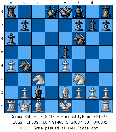 Last move : 0-1 2018 August 6 16:15:19 [Event "FICGS__CHESS__CUP_STAGE_1_GROUP_03__000002"] [Site "FICGS"] [Date "2018.07.02"] [Round "1"] [White "Csoma,Robert"] [Black "Pareschi,Remo"] [Result "0-1"] [WhiteElo "1574"] [BlackElo "2107"] 1.Nf3 d5 2.d4 c5 3.c4 dxc4 4.Qa4+ Bd7 5.Qxc4 cxd4 6.Nxd4 e5 7.Nf3 Nf6 8.Nc3 Nc6 9.e4 a6 10.a4 Be6 11.Qd3 Nb4 12.Qb1 Bb3 13.Be2 Bc2 0-1 Reti Opening Player Black won this chess game. Follow this game move after move (download)It is no time to be playing Chess when the house is on fire. (Italian Proverb) Moralische Siege zählen nicht. (Savielly Grigorievitsch Tartakower) El ganador de una partida es aquel jugador que hace el penúltimo error. (Savielly Tartakover) Les Echecs, c'est l'art de la guerre sans les charniers, c'est la résurrection des morts tombés au champ d'honneur, l'espoir perpétuel, la suprématie de l'intelligence sur la force, la culture de l'esprit. (F. Szpiner) It is the aim of the modern school, not to treat every position according to one general law, but according to the principle inherent in the position. (Richard Reti)