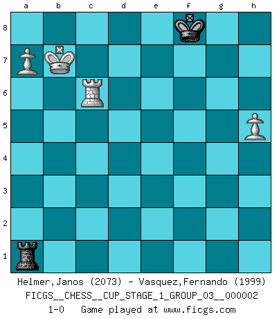 Last move : 1-0 2018 November 26 22:58:7 [Event "FICGS__CHESS__CUP_STAGE_1_GROUP_03__000002"] [Site "FICGS"] [Date "2018.07.02"] [Round "1"] [White "Helmer,Janos"] [Black "Vasquez,Fernando"] [Result "1-0"] [WhiteElo "2073"] [BlackElo "1999"] 1.Nf3 Nf6 2.c4 e6 3.g3 b6 4.Bg2 Bb7 5.O-O Be7 6.Nc3 O-O 7.Re1 c5 8.e4 d6 9.d4 cxd4 10.Nxd4 Qc8 11.b3 a6 12.Bb2 Re8 13.Rc1 Nbd7 14.Qe2 Bf8 15.f4 e5 16.fxe5 dxe5 17.Nf5 g6 18.Ne3 Bb4 19.Ned5 Nxd5 20.cxd5 Qc5+ 21.Kh1 Qe7 22.Rf1 Red8 23.Rf3 Rf8 24.Rcf1 Rac8 25.h4 b5 26.Bh3 Bc5 27.Kh2 Rc7 28.Nd1 Bc8 29.Nf2 Nf6 30.Rxf6 Qxf6 31.Bxc8 Rfxc8 32.Ng4 Qd8 33.Nh6+ Kf8 34.Qg4 Bd4 35.Bxd4 exd4 36.Qf4 f6 37.e5 f5 38.d6 Rg7 39.Rf2 Qe8 40.Qxd4 Qe6 41.g4 Re8 42.gxf5 Qxe5+ 43.Qxe5 Rxe5 44.fxg6 Ke8 45.Ng4 Re6 46.Nf6+ Rxf6 47.Rxf6 hxg6 48.Kg3 a5 49.Kg4 Kd7 50.Kg5 Rg8 51.Rxg6 Re8 52.h5 Re5+ 53.Kh6 a4 54.bxa4 bxa4 55.Rg5 Re8 56.Kg7 Kxd6 57.Ra5 Re7+ 58.Kg6 Re6+ 59.Kg5 Ke7 60.Rxa4 Kf7 61.Ra7+ Kg8 62.a4 Re5+ 63.Kg6 Re6+ 64.Kf5 Rd6 65.Ra5 Rd3 66.Rb5 Rd6 67.a5 Ra6 68.Ke4 Kg7 69.Kd4 Kh7 70.Kc5 Re6 71.Rb7+ Kg8 72.Rc7 Kf8 73.Kb5 Re5+ 74.Rc5 Re6 75.a6 Re7 76.Kb6 Re6+ 77.Rc6 Re1 78.a7 Rb1+ 79.Kc7 Ra1 80.Kb7 1-0 Reti Opening Kingside Castling by player White (move 5) Kingside Castling by player Black (move 6) 10 pieces endgame at move 51 : White KRPPPP , Black KRPP WHITE : King + 1 Rook 4 Pawns BLACK : King + 1 Rook 2 Pawns 9 pieces endgame at move 54 : White KRPPPP , Black KRP WHITE : King + 1 Rook 4 Pawns BLACK : King + 1 Rook 1 Pawn 8 pieces endgame at move 54 : White KRPPP , Black KRP WHITE : King + 1 Rook 3 Pawns BLACK : King + 1 Rook 1 Pawn 7 pieces endgame at move 56 : White KRPP , Black KRP WHITE : King + 1 Rook 2 Pawns BLACK : King + 1 Rook 1 Pawn 6 pieces endgame at move 60 : White KRPP , Black KR WHITE : King + 1 Rook 2 Pawns BLACK : King + 1 Rook Player White won this chess game. Follow this game move after move (download)Pawn endings are to Chess what putting is to golf. (Cecil Purdy) Ohne Fehler kann es keine Brillanz geben. (Emanuel Lasker) Bobby es el jugador de Ajedrez mas fino que este país jamás haya producido. Su memoria para las movidas, su brillantez en soñar combinaciones y su feróz determinación por la victoria son algo extraño. (John Collins) Il n'y a plus de joueurs du niveau de Jacob Murray dont la seule quête est le beau jeu, le plaisir de voir les pièces construire quelque chose. Sur 10 idées à la minute, 9 seront sans intérêt, la dernière s'avèrera géniale. (Christian Bauer) A specialist learns more and more about less and less until he knows everything about nothing. (Nicholas Murray Butler)