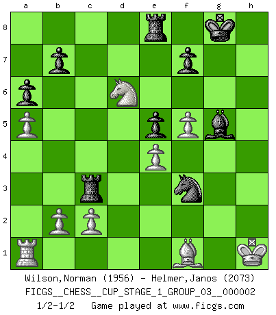 Last move : 1/2-1/2 2018 August 4 16:16:57 [Event "FICGS__CHESS__CUP_STAGE_1_GROUP_03__000002"] [Site "FICGS"] [Date "2018.07.02"] [Round "1"] [White "Wilson,Norman"] [Black "Helmer,Janos"] [Result "1/2-1/2"] [WhiteElo "1956"] [BlackElo "2073"] 1.e4 c5 2.Nf3 d6 3.d4 cxd4 4.Nxd4 Nf6 5.Nc3 a6 6.Be2 e5 7.Nb3 Be6 8.O-O Nbd7 9.a4 Rc8 10.Re1 Be7 11.Bf3 O-O 12.Be3 Qc7 13.a5 Rfe8 14.g3 h6 15.Bg2 Ng4 16.Bd2 Ngf6 17.Be3 Bd8 18.h3 Qb8 19.Kh2 Kh7 20.Kh1 Rf8 21.Kg1 Kg8 22.Ra3 Re8 23.Nd2 Qc7 24.Ra1 Nf8 25.Nf1 Ng6 26.Qd2 Qd7 27.Kh2 Ne7 28.Red1 Bc7 29.f4 Nc6 30.f5 Bc4 31.g4 Nd4 32.Bxh6 gxh6 33.Qxh6 Bd8 34.g5 Qe7 35.Ne3 Nh7 36.h4 Nxg5 37.Rg1 Qf6 38.Qxg5+ Qxg5 39.hxg5 Bxg5 40.Bf1 Nf3+ 41.Kh1 Nxg1 42.Nxc4 Nf3 43.Nxd6 Rxc3 1/2-1/2 Sicilian : Najdorf, Opovcensky variation Kingside Castling by player White (move 8) Kingside Castling by player Black (move 11) This chess game ended in a draw. Follow this game move after move (download)The older I grow, the more I value pawns. (Paul Keres) Es ist peinlich, dass ich nie Weltmeister wurde. Es wäre leicht, Leonid Breschnjew als Ursache vorzuschieben, dessen Apparat den Vorzeigekommunisten Anatoli Karpow in allem unterstützte. Aber Garri Kasparow zum Beispiel, der ebenfalls von den Sowjets unerwünscht war, hat trotz der Widerstände den WM-Titel erobert. (Viktor Kortschnoi) Fischer es el jugador mas fuerte del mundo. De hecho, el jugador mas fuerte que jamas haya existido. (Larry Evans) La victoire dans une partie d'Echecs appartient la plupart du temps à celui qui voit un peu plus loin que l'adversaire. (Lasker) Go and wake up your luck. (Persian saying)