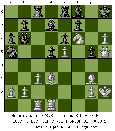 Last move : 1-0 2018 July 15 17:3:8 [Event "FICGS__CHESS__CUP_STAGE_1_GROUP_03__000002"] [Site "FICGS"] [Date "2018.07.02"] [Round "1"] [White "Helmer,Janos"] [Black "Csoma,Robert"] [Result "1-0"] [WhiteElo "2073"] [BlackElo "1574"] 1.Nf3 d5 2.d4 Nf6 3.Bf4 c5 4.e3 Nc6 5.c3 e6 6.Nbd2 Bd6 7.Bg3 O-O 8.Bd3 Re8 9.Ne5 cxd4 10.exd4 Qc7 11.Ndf3 h6 12.Qe2 Nd7 13.O-O Ndxe5 14.dxe5 Bf8 15.Rfd1 Bd7 16.Rac1 Rac8 17.h4 g6 18.h5 g5 19.Nh2 Bg7 20.Ng4 Qb6 21.Kh2 Na5 22.f4 a6 23.fxg5 hxg5 24.h6 Bf8 25.Nf6+ Kh8 26.Qh5 1-0 Reti Opening Kingside Castling by player Black (move 7) Kingside Castling by player White (move 13) Player White won this chess game. Follow this game move after move (download)Man is a frivolous, a specious creature, and like a Chess player, cares more for the process of attaining his goal than for the goal itself. (Dostoyevsky) Es ist schade, dass viele Schachsportler vergessen, wie wichtig Auftreten und angemessene Kleidung sind. (Alexandra Kosteniuk) Tu eres para mi la Reina en d8 y yo soy el Peón en d7!!. (GM Eduard Gufeld) Le jeu d'échecs est comme rejeté hors du temps. (Antoine de Saint-Exupéry) Whoever said the pen is mightier than the sword obviously never encountered automatic weapons. (US General Douglas MacArthur)