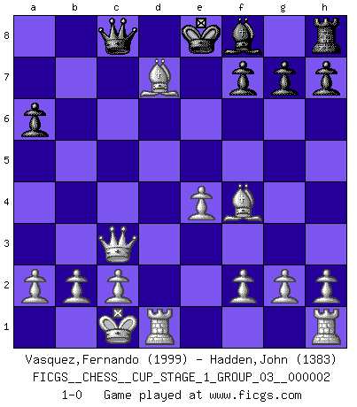 Last move : 1-0 2018 August 18 21:8:26 [Event "FICGS__CHESS__CUP_STAGE_1_GROUP_03__000002"] [Site "FICGS"] [Date "2018.07.02"] [Round "1"] [White "Vasquez,Fernando"] [Black "Hadden,John"] [Result "1-0"] [WhiteElo "1999"] [BlackElo "1383"] 1.e4 e5 2.Nf3 Nc6 3.d4 exd4 4.Nxd4 d6 5.Nc3 Nxd4 6.Qxd4 Be6 7.Bf4 Ne7 8.Bb5+ Nc6 9.Nd5 a6 10.Ba4 b5 11.Qc3 Ne7 12.Nxc7+ Kd7 13.Nxb5 Rc8 14.Nxd6 Nc6 15.Nxc8 Qxc8 16.O-O-O Ke8 17.Bxc6+ Bd7 18.Bxd7+ 1-0 Scotch game Queenside Castling by player White (move 16) Player White won this chess game. Follow this game move after move (download)I am the best player in the world and I am here to prove it. (Bobby Fischer) Schach ist ein Kampf gegen den Fehler. (Johannes Herrman Zukertort) Bobby solo arroja las piezas y solas caen en las casillas correctas. (Miguel Najdorf ) Les réformistes prétendent que les progrès de la théorie conduiront à la disparition des échecs, et qu'il faut, pour leur rendre vie, en remanier les règles. En réalité, qu'exprime cette affirmation? Le mépris de l'intuition, de l'imagination et de tous les autres éléments qui font des échecs un art. (Alexander Alekhine) There will be no order, only chaos. (Sol Robeson in Pi by Darren Aronofsky)