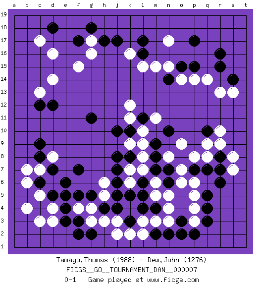Last move : 0-1 2007 July 4 22:8:48 [Event "FICGS__GO__TOURNAMENT_DAN__000007"] [Site "FICGS"] [Date "2007.05.11"] [Round "1"] [Black "Tamayo,Thomas"] [White "Dew,John"] [Result "0-1"] [Rating 1 "1988"] [Rating 2 "1276"] 1.r16 d16 2.q3 d4 3.p17 r10 4.r6 r13 5.f3 h3 6.f5 d6 7.f7 d8 8.k3 m3 9.k5 k4 10.j4 k2 11.l4 l2 12.n2 n3 13.o2 g3 14.e3 d3 15.f2 f4 16.e4 g4 17.d5 c5 18.e5 n5 19.f17 d14 20.d18 c17 21.j17 p4 22.q4 p3 23.p2 p6 24.c12 c13 25.d12 f15 26.c4 c3 27.c6 b4 28.d7 c7 29.e6 b6 30.c8 b7 31.c9 h6 32.g5 h5 33.h4 j3 34.j7 k6 35.l6 l7 36.j5 m6 37.j6 k7 38.j8 g17 39.g18 g16 40.h17 n17 41.l17 n15 42.s14 s13 43.r8 q14 44.r15 k16 45.l16 l15 46.g11 q8 47.q7 p8 48.p7 o7 49.q10 r9 50.p15 p14 51.o15 o14 52.n14 m15 53.n10 k9 54.k8 l8 55.k10 l10 56.l11 k11 57.j10 k12 58.g2 j2 59.m2 l3 60.l5 s7 61.r7 s8 62.q5 p5 63.o8 q9 64.n7 o6 65.m9 l9 66.m7 m11 67.n6 m5 68.m4 n4 69.o3 n8 70.m8 o9 0-1 Here are the names of the openings (joseki) played in the four corners : Corner d4 : d4 f3 Hoshi (Hwajeom, Seongjeom, Xingwei`) 4-4 Point. The star or hoshi (4-4) point, emphasizing influence at the potential expense of territory. Ikken Kakari (Hankan Keolch'im, Yi Gua`jiao~, 1-Space Low Approach). Black 2 is the standard approach move to the 4-4. Corner d16 : d16 f17 Hoshi (Hwajeom, Seongjeom, Xingwei`) 4-4 Point. The star or hoshi (4-4) point, emphasizing influence at the potential expense of territory. Ikken Kakari (Hankan Keolch'im, Yi Gua`jiao~, 1-Space Low Approach). Black 2 is the standard approach move to the 4-4. Player White won this Go (weiqi, baduk) game. Follow this game move after move (download)Don't make empty triangles. (Anonymous) Inventor: A person who makes an ingenious arrangement of wheels, levers and springs, and believes it civilization. (Ambrose Bierce, The Devil's Dictionary)