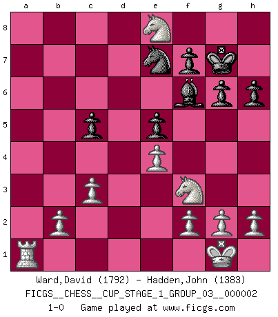 Last move : 1-0 2018 August 6 4:15:35 [Event "FICGS__CHESS__CUP_STAGE_1_GROUP_03__000002"] [Site "FICGS"] [Date "2018.07.02"] [Round "1"] [White "Ward,David"] [Black "Hadden,John"] [Result "1-0"] [WhiteElo "1792"] [BlackElo "1383"] 1.e4 e5 2.Nf3 Nc6 3.Bb5 a6 4.Ba4 b5 5.Bb3 d6 6.O-O Be6 7.c3 Nf6 8.d4 Be7 9.d5 Bxd5 10.Bxd5 Qd7 11.a4 O-O 12.Bg5 h6 13.Bxf6 Bxf6 14.Na3 Ne7 15.Bxa8 Rxa8 16.Qb3 c5 17.axb5 axb5 18.Qxb5 Qxb5 19.Nxb5 Rxa1 20.Rxa1 g6 21.Nxd6 Kg7 22.Ne8+ 1-0 Ruy Lopez : Caro variation Kingside Castling by player White (move 6) Kingside Castling by player Black (move 11) Player White won this chess game. Follow this game move after move (download)A good player is always lucky. (Jose Raul Capablanca) Kein Großmeister ist normal. Sie unterscheiden sich nur im Ausmaß Ihrer Verrücktheit. (Viktor Kortschnoi) La táctica fluye a partir de una posición superior. (Bobby Fischer) Toute estimation doit être constamment réévaluée. (Jacob Estrin) Drag your thoughts away from your troubles... by the ears, by the heels, or any other way you can manage it. (Mark Twain)