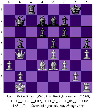 Last move : 1/2-1/2 2018 October 2 9:59:37 [Event "FICGS__CHESS__CUP_STAGE_1_GROUP_04__000002"] [Site "FICGS"] [Date "2018.07.02"] [Round "1"] [White "Wosch,Arkadiusz"] [Black "Gazi,Miroslav"] [Result "1/2-1/2"] [WhiteElo "2403"] [BlackElo "2260"] 1.e4 c5 2.Nf3 d6 3.d4 cxd4 4.Nxd4 Nf6 5.Nc3 a6 6.Be3 e5 7.Nb3 Be6 8.f3 h5 9.Qd2 Nbd7 10.O-O-O Be7 11.Kb1 Qc7 12.Rc1 Nb6 13.Rd1 Nbd7 14.a3 Rc8 15.h4 b5 16.Bg5 Qb7 17.Nd5 Bd8 18.Nxf6+ gxf6 19.Be3 Be7 20.Be2 Nc5 21.Na5 Qc7 22.c4 Nb7 23.Nxb7 Qxb7 24.cxb5 axb5 25.Rc1 O-O 26.Qa5 Bd7 27.Qb4 Rfe8 28.Rxc8 Rxc8 29.Bd3 1/2-1/2 Sicilian : Najdorf, Byrne (English) attack Queenside Castling by player White (move 10) Kingside Castling by player Black (move 25) This chess game ended in a draw. Follow this game move after move (download)Becoming successful at Chess allows you to discover your own personality. That's what I want for the kids I teach. (Saudin Robovic) Es hat in meinem Leben Zeiten gegeben, in denen das Schachspiel, wenn nicht zum Lebenszweck, so doch zu einem regelrechten Lebensersatz geworden ist. Man fühlt sich in solchen Zeiten nicht so, als besäße man eine göttliche Gabe, sondern eher so, als sei man von ihr besessen. (Garry Kasparov) Yo no creo en la psicología. Yo creo en las buenas movidas. (Bobby Fischer) La victoire dans une partie d'Echecs appartient la plupart du temps à celui qui voit un peu plus loin que l'adversaire. (Lasker) Logic : The art of thinking and reasoning in strict accordance with the limitations and incapacities of the human misunderstanding. (Ambrose Bierce)