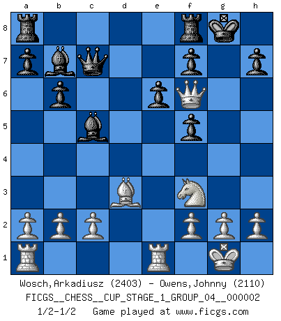 Last move : 1/2-1/2 2018 September 21 20:31:30 [Event "FICGS__CHESS__CUP_STAGE_1_GROUP_04__000002"] [Site "FICGS"] [Date "2018.07.02"] [Round "1"] [White "Wosch,Arkadiusz"] [Black "Owens,Johnny"] [Result "1/2-1/2"] [WhiteElo "2403"] [BlackElo "2110"] 1.e4 e6 2.d4 d5 3.Nc3 dxe4 4.Nxe4 Nd7 5.Nf3 Ngf6 6.Nxf6+ Nxf6 7.Bd3 c5 8.O-O cxd4 9.Nxd4 Bc5 10.Nf3 O-O 11.Qe2 Qc7 12.Bg5 b6 13.Bxf6 gxf6 14.Rfe1 f5 15.Qd2 Bb7 16.Qg5+ Kh8 17.Qf6+ Kg8 18.Qg5+ Kh8 19.Qf6+ Kg8 1/2-1/2 French : Rubinstein variation Kingside Castling by player White (move 8) Kingside Castling by player Black (move 10) This chess game ended in a draw. Follow this game move after move (download)When I asked Fischer why he had not played a certain move in our game, he replied: 'Well, you laughed when I wrote it down !' (Mikhail Tal) Lisa Lane, amerikanische Schachmeisterin, hatte Fischer einmal als stärksten lebenden Spieler bezeichnet. Antwort: Das ist richtig, aber Lisa Lane ist eigentlich nicht in der Lage, das zu beurteilen. (Robert James Fischer) Las ideas audaces son como las piezas del Ajedrez que avanzan hacia adelante. Ellas pueden ser vencidas, pero también pueden iniciar una partida victoriosa. (Goethe) Aucun coup ne doit être joué sans but. (Pedro Damiano) Some people are so afraid to die that they never begin to live. (Henry Van Dyke)