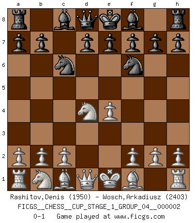 Last move : 0-1 2018 August 6 21:38:9 [Event "FICGS__CHESS__CUP_STAGE_1_GROUP_04__000002"] [Site "FICGS"] [Date "2018.07.02"] [Round "1"] [White "Rashitov,Denis"] [Black "Wosch,Arkadiusz"] [Result "0-1"] [WhiteElo "1950"] [BlackElo "2403"] 1.e4 c5 2.Nf3 Nc6 3.d4 cxd4 4.Nxd4 Nf6 0-1 This chess game has been lost on time (started : 2018.07.02 2:46:11) Sicilian defense Player Black won this chess game. Follow this game move after move (download)Not only will I predict his triumph over Botvinnik, but I'll go further and say that he'll probably be the greatest Chess player that ever lived. (John Collins) Der beste Spieler in einem Turnier gewinnt es nie. Er landet auf Platz zwei oder drei. (Siegbert Tarrasch) Buenas posiciones no logran ganar juegos, buenas movidas sí. (Gerald Abrahams) Que feriez-vous si vous étiez en train de jouer aux échecs et que la fin du monde arrive ? Je continuerais à jouer. (Saint Borromée) To steal ideas from one person is plagiarism. To steal from many is research. (Unknown)
