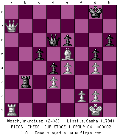 Last move : 1-0 2018 October 3 14:18:54 [Event "FICGS__CHESS__CUP_STAGE_1_GROUP_04__000002"] [Site "FICGS"] [Date "2018.07.02"] [Round "1"] [White "Wosch,Arkadiusz"] [Black "Lipsits,Sasha"] [Result "1-0"] [WhiteElo "2403"] [BlackElo "1794"] 1.e4 e5 2.Nf3 Nc6 3.Bc4 Bc5 4.c3 Nf6 5.d3 d6 6.O-O O-O 7.Re1 Bb6 8.a4 Bg4 9.h3 Be6 10.Bxe6 fxe6 11.b4 a6 12.Na3 Ba7 13.Nc4 b5 14.Ne3 Qd7 15.Ng4 Nxg4 16.hxg4 d5 17.Qc2 Qd6 18.Bg5 d4 19.axb5 axb5 20.c4 Nxb4 21.Qb3 bxc4 22.Qxc4 Bb6 23.Bh4 c5 24.Bg3 Nc6 25.Reb1 Rxa1 26.Rxa1 Ba5 27.Rb1 Ra8 28.Qa4 Rc8 29.Nxe5 Nxe5 30.Qxa5 Rb8 31.Ra1 h6 32.Qd2 g5 33.Qa5 Rf8 34.Qa7 Rf7 35.Qa2 Rb7 36.Qa8+ Rb8 37.Qa7 Rb3 38.Bxe5 1-0 Giuoco Piano Kingside Castling by player White (move 6) Kingside Castling by player Black (move 6) Player White won this chess game. Follow this game move after move (download)In complicated positions, Bobby Fischer hardly had to be afraid of anybody. (Paul Keres) Je mehr ich von der FIDE weiss, um so weniger verstehe ich. (Alexander Kalifman) El Peón aislado arroja penumbra sobre todo el tablero. (Aaron Nimzovich) Demandez au pauvre Cg1 ce qu'il en pense. Eduard Gufeld à propos de la variante Saemisch de l'Est-Indienne. Chess, like love, like music, has the power to make people happy. (Siegbert Tarrasch)