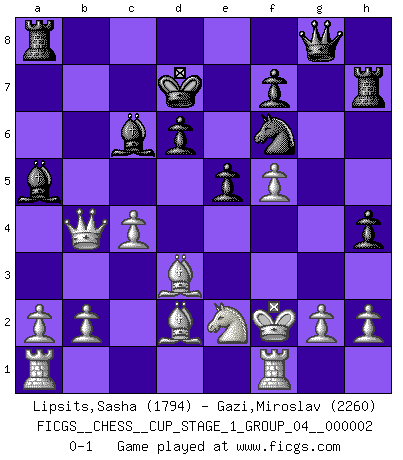 Last move : 0-1 2018 August 23 12:53:42 [Event "FICGS__CHESS__CUP_STAGE_1_GROUP_04__000002"] [Site "FICGS"] [Date "2018.07.02"] [Round "1"] [White "Lipsits,Sasha"] [Black "Gazi,Miroslav"] [Result "0-1"] [WhiteElo "1794"] [BlackElo "2260"] 1.e4 c5 2.Nf3 d6 3.d4 cxd4 4.Nxd4 Nf6 5.Nc3 a6 6.Bc4 e6 7.O-O Be7 8.Qf3 Bd7 9.Qg3 Nc6 10.Be3 b5 11.Nxc6 Bxc6 12.Bd3 h5 13.f3 h4 14.Qh3 b4 15.Ne2 e5 16.c4 Rh7 17.f4 Bd7 18.f5 g6 19.Qf3 gxf5 20.exf5 Rc8 21.Qb7 Bc6 22.Qxa6 Kd7 23.Kf2 Ra8 24.Qb6 Qg8 25.Bd2 Bd8 26.Qxb4 Ba5 0-1 Sicilian : Najdorf, Lipnitzky attack Kingside Castling by player White (move 7) Player Black won this chess game. Follow this game move after move (download)Examine moves that smite! A good eye for smites is far more important than a knowledge of strategical principles. (Purdy) Ja, ich habe einmal eine Blitzpartie gespielt, es war in einem Zug, 1929. --im Interview 1989 (Mikhail Moiseyevich Botvinik) Dejen al perfeccionista jugar por correo. (Yasser Seirawan) On entre au jeu d'Echecs comme on entre en Religion. Pour le joueur d'Echecs, la partie d'Echecs c'est l'office, la messe, le défilé du 1er Mai, le dépôt de gerbe au Monument aux Morts. C'est un drame sacré. (Michel Roos) Optimism is a variety of information deficit. Sometimes especially true for correspondence chess games. (Michael Aigner)