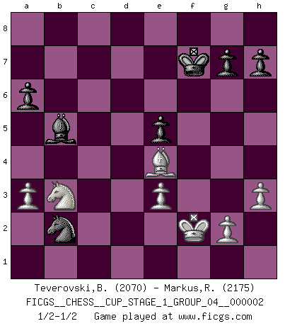 Last move : 1/2-1/2 2018 October 6 0:13:14 [Event "FICGS__CHESS__CUP_STAGE_1_GROUP_04__000002"] [Site "FICGS"] [Date "2018.07.02"] [Round "1"] [White "Teverovski,Bogoljub"] [Black "Markus,Roland"] [Result "1/2-1/2"] [WhiteElo "2070"] [BlackElo "2175"] 1.d4 Nf6 2.c4 e6 3.Nc3 d5 4.Nf3 Be7 5.Bf4 O-O 6.e3 Nbd7 7.Be2 dxc4 8.O-O c5 9.dxc5 Nxc5 10.Bxc4 a6 11.Nd4 Bd7 12.a3 Rc8 13.Rc1 Nce4 14.Nxe4 Nxe4 15.Bd3 Rxc1 16.Qxc1 Nf6 17.h3 Qb6 18.Bc7 Qc5 19.Qxc5 Bxc5 20.Be5 Bb6 21.Rc1 Nd5 22.Rc2 f6 23.Bd6 Re8 24.Bc5 Rc8 25.Bxb6 Rxc2 26.Bxc2 Nxb6 27.Be4 e5 28.Nb3 Na4 29.Bxb7 Bb5 30.f4 Kf7 31.fxe5 fxe5 32.Be4 Nxb2 33.Kf2 1/2-1/2 Queen's pawn game Kingside Castling by player Black (move 5) Kingside Castling by player White (move 8) This chess game ended in a draw. Follow this game move after move (download)Chess is life. (Bobby Fischer) Glücklicherweise sind Großmeister Ruben Fines reine Schachbücher weniger phallozentrisch [als seine Schachpsychologie] und deswegen auch weniger lächerlich. (Nigel Short) Coloca el contenido de las piezas del Ajedrez en un sombrero, agitalo vigorosamente, arrojalas en un tablero desde una altura de 30 centimetros y así obtendras el estilo de Steinitz. (H. E. Bird) Shah mat. Le roi est mort. Cri de fierté d'un joueur venant de terrasser son adversaire, courtoisement, sans effusion de sang. A good book on your shelf is a friend that turns its back on you and remains a friend. (Author unknown)