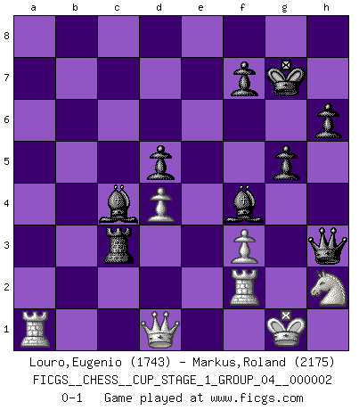 Last move : 0-1 2018 October 30 20:6:49 [Event "FICGS__CHESS__CUP_STAGE_1_GROUP_04__000002"] [Site "FICGS"] [Date "2018.07.02"] [Round "1"] [White "Louro,Eugenio"] [Black "Markus,Roland"] [Result "0-1"] [WhiteElo "1743"] [BlackElo "2175"] 1.e4 e5 2.Nf3 Nc6 3.Bb5 a6 4.Ba4 Nf6 5.O-O Be7 6.Re1 b5 7.Bb3 O-O 8.c3 d5 9.exd5 Nxd5 10.Nxe5 Nxe5 11.Rxe5 c6 12.d4 Bd6 13.Re2 Bg4 14.f3 Bf5 15.g3 Qc7 16.a4 Rae8 17.axb5 Bxg3 18.Bxd5 Bxh2+ 19.Kh1 Qg3 20.Be3 Rxe3 21.Rxe3 Qh4 22.Re2 Bf4 23.Kg1 cxd5 24.Nd2 axb5 25.Nf1 Bh3 26.Nh2 h6 27.Kh1 Qh5 28.Qd3 Rb8 29.Rf2 g6 30.Qd1 b4 31.Re2 bxc3 32.bxc3 Bf5 33.Kg1 Kg7 34.Qe1 Rb6 35.Qf2 Rc6 36.Qe1 Bd3 37.Rb2 Qh3 38.Rg2 Re6 39.Qd1 Re3 40.Rf2 g5 41.Ng4 Bc4 42.Nh2 Rxc3 0-1 Ruy Lopez : Closed, 7...O-O Kingside Castling by player White (move 5) Kingside Castling by player Black (move 7) Player Black won this chess game. Follow this game move after move (download)Every Chess master was once a beginner. (Chernev) Ja, jede Frau in Holland liebt mich bestimmt, und alle Männer hassen mich. (Loek van Wely) Solo existe una cosa que Fischer hace en el Ajedrez sin placer: ¡perder!. (Boris Spassky) La conception d'un plan est le processus par lequel un joueur exploite les avantages de sa position tout en s'efforçant d'en réduire au minimum les inconvénients. Afin de garantir le succès, un plan doit toujours se fonder sur un diagnostic objectif des particularités d'une position. La conception d'un plan est d'autant plus difficile que la position est équilibrée, et grandement facilitée lorsqu'il n'existe qu'un seul plan susceptible de répondre aux exigences de la position. (Harry Golombek) Hardware: the parts of a computer that can be kicked. (Jeff Persis)