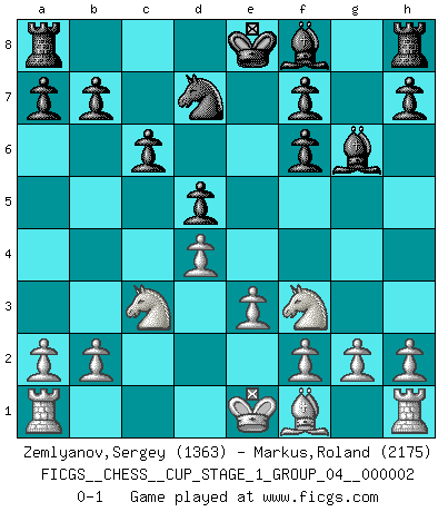 Last move : 0-1 2018 September 4 23:44:25 [Event "FICGS__CHESS__CUP_STAGE_1_GROUP_04__000002"] [Site "FICGS"] [Date "2018.07.02"] [Round "1"] [White "Zemlyanov,Sergey"] [Black "Markus,Roland"] [Result "0-1"] [WhiteElo "1363"] [BlackElo "2175"] 1.d4 Nf6 2.c4 e6 3.Nc3 d5 4.cxd5 exd5 5.Bg5 c6 6.e3 Bf5 7.Qf3 Bg6 8.Bxf6 Qxf6 9.Qxf6 gxf6 10.Nf3 Nd7 0-1 This chess game has been lost on time (started : 2018.07.02 2:46:11) Queen's pawn game Player Black won this chess game. Follow this game move after move (download)Look at Garry Kasparov. After he loses, invariably he wins the next game. He just kills the next guy. That's something that we have to learn to be able to do. (Maurice Ashley) Im Wettkampf zwischen starken Meistern kommen Fehler sehr selten vor, deshalb ist es mit bloßem Warten nicht getan. (José Raúl Capablanca) Con el tiempo, empecé a progresar en partidas decisivas. Tal vez porque me di cuenta de una simple verdad: no solo estaba yo nervioso sino también mi oponente. (Mikhail Tal) Aux échecs, les retours au sommet sont rares : les dommages psychologiques consécutifs à une défaite sont trop sévères. (Daily Telegraph) As the days dwindle down... to a precious few. (Maxwell Anderson)