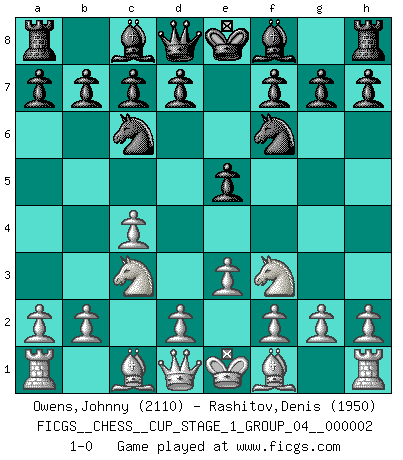 Last move : 1-0 2018 August 6 21:38:9 [Event "FICGS__CHESS__CUP_STAGE_1_GROUP_04__000002"] [Site "FICGS"] [Date "2018.07.02"] [Round "1"] [White "Owens,Johnny"] [Black "Rashitov,Denis"] [Result "1-0"] [WhiteElo "2110"] [BlackElo "1950"] 1.c4 e5 2.Nc3 Nf6 3.Nf3 Nc6 4.e3 1-0 This chess game has been lost on time (started : 2018.07.02 2:46:11) English Opening Player White won this chess game. Follow this game move after move (download)If Chess is a science, it's a most inexact one. If Chess is an art, it is too exacting to be seen as one. If Chess is a sport, it's too esoteric. If Chess is a game, it's too demanding to be just a game. If Chess is a mistress, she's a demanding one. If Chess is a passion, it's a rewarding one. If Chess is life, it's a sad one. (Unknown) Wer wird heute Abend ihr Gegner sein? -- Heute Abend spiele ich gegen die schwarzen Steine. (Akiba Rubinstein) Tu puedes aprender mucho mas de una partida que pierdas que de una partida ganada. Tendras que perder cientos de partidas antes de llegar a ser un buen jugador. (Jose Raul Capablanca) La vie et les Echecs sont tous les deux une lutte constante. (Lasker) Internet: Absolute communication, absolute isolation. (Paul Carvel)
