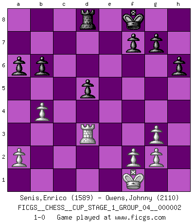 Last move : 1-0 2018 October 11 20:8:20 [Event "FICGS__CHESS__CUP_STAGE_1_GROUP_04__000002"] [Site "FICGS"] [Date "2018.07.02"] [Round "1"] [White "Senis,Enrico"] [Black "Owens,Johnny"] [Result "1-0"] [WhiteElo "1589"] [BlackElo "2110"] 1.d4 e6 2.e4 d5 3.Nd2 dxe4 4.Nxe4 Nd7 5.Nf3 Ngf6 6.Nxf6+ Nxf6 7.Bd3 c5 8.dxc5 Bxc5 9.O-O O-O 10.Bf4 b6 11.Bg5 Bb7 12.Qe2 h6 13.Bh4 Qc7 14.Bg3 Qc6 15.Rfd1 Ne4 16.Bxe4 Qxe4 17.Qxe4 Bxe4 18.c3 Rfd8 19.Nd4 Bb7 20.b4 Be7 21.Nb5 a6 22.Nd6 Bd5 23.c4 Bxd6 24.cxd5 Bxg3 25.hxg3 Rxd5 26.Rxd5 exd5 27.Rd1 Rd8 28.Kf1 Kf8 29.Rd3 1-0 This chess game has been lost on time (started : 2018.07.02 2:46:11) Queen's pawn Kingside Castling by player White (move 9) Kingside Castling by player Black (move 9) Player White won this chess game. Follow this game move after move (download)In blitz, the Knight is stronger than the Bishop. (Vlastimil Hort) Ich rechne überhaupt nicht voraus. Ich gewinne auch so. (Robert James Fischer) De todos mis libros Rusos, la defensa contiene y difunde el 'calor' mas grande que pudiese verse extraño al observar lo supremamente abstracto que el Ajedrez supuestamente es. (Vladimir Nabokov) Un footballeur joue avec ses pieds, parfois avec sa tête. Un joueur d'échecs ne joue qu'avec sa tête. Et quand il ne joue plus, il meurt. (Jacob Murray) In every real man a child is hidden that wants to play. (Friedrich Nietzsche)