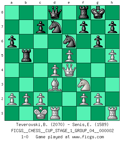 Last move : 1-0 2018 July 25 0:31:8 [Event "FICGS__CHESS__CUP_STAGE_1_GROUP_04__000002"] [Site "FICGS"] [Date "2018.07.02"] [Round "1"] [White "Teverovski,Bogoljub"] [Black "Senis,Enrico"] [Result "1-0"] [WhiteElo "2070"] [BlackElo "1589"] 1.e4 e6 2.d4 d5 3.Nc3 Nf6 4.Bg5 Be7 5.e5 Nfd7 6.h4 a6 7.Qg4 Nf8 8.Bxe7 Qxe7 9.Nxd5 exd5 10.Qxc8+ Qd8 11.Qxb7 Nbd7 12.Qxd5 Ne6 13.O-O-O O-O 14.Qe4 Rb8 15.Bd3 g6 16.Nf3 Rb5 17.h5 1-0 French : Albin-Alekhine-Chatard attack, Maroczy variation Queenside Castling by player White (move 13) Kingside Castling by player Black (move 13) Player White won this chess game. Follow this game move after move (download)The hardest game to win is a won game. (Emanuel Lasker) In Buenos Aires ist es nicht mein vorrangiges Ziel ein starkes Turnier zu organisieren, sondern ein Turnier für Gentlemen. Ich würde nie Kamsky einladen. Ich mag keine Probleme. (Miguel Najdorf) La maestría del Ajedrez consiste esencialmente en analizar posiciónes de Ajedrez con precisión. (Mikhail Botvinnik) Comme les marins qui ont mille raisons différentes d'aller en mer, les joueurs d'échecs en ont tout autant avant de s'installer devant une table et jouer... (Vincent Bertignac, philosophe) Don't be discouraged. It's often the last key in the bunch that opens the lock. (Author unknown)