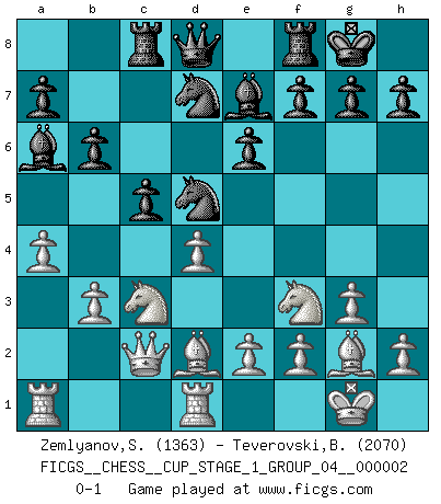 Last move : 0-1 2018 August 31 23:25:8 [Event "FICGS__CHESS__CUP_STAGE_1_GROUP_04__000002"] [Site "FICGS"] [Date "2018.07.02"] [Round "1"] [White "Zemlyanov,Sergey"] [Black "Teverovski,Bogoljub"] [Result "0-1"] [WhiteElo "1363"] [BlackElo "2070"] 1.d4 d5 2.c4 e6 3.Nf3 Nf6 4.g3 Bb4+ 5.Bd2 Be7 6.Bg2 O-O 7.O-O c6 8.Qc2 b6 9.Rd1 Ba6 10.b3 Nbd7 11.a4 c5 12.cxd5 Nxd5 13.Nc3 Rc8 0-1 This chess game has been lost on time (started : 2018.07.02 2:46:11) Queen's gambit declined Kingside Castling by player Black (move 6) Kingside Castling by player White (move 7) Player Black won this chess game. Follow this game move after move (download)Chess opens and enriches your mind. (Saudin Robovic) Der Verteidiger gebe der Gewalt nach, aber nur der Gewalt. Er schaffe sich nicht freiwillig, etwa aus Blindheit oder aus Schrecken, irgendwelche Schwächen. Er lasse sich nicht bluffen. (Emanuel Lasker) Bobby Fischer es el jugador de Ajedrez mas grande que jamás haya existido. (Ken Smith) Horreur, mais aussi harmonie suprême : qu'y avait-il en effet au monde en dehors des échecs ? Le brouillard, l'inconnu, le non-être... (Vladimir Nabokov) Employ the attack like tactic of defense. (Chinese proverb)