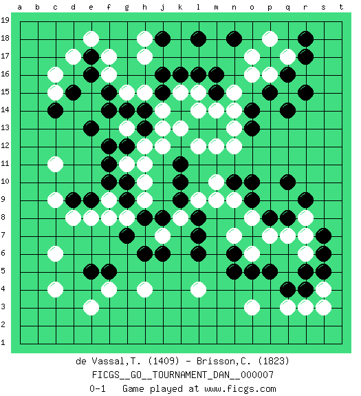 Last move : 0-1 2007 July 13 16:54:45 [Event "FICGS__GO__TOURNAMENT_DAN__000007"] [Site "FICGS"] [Date "2007.05.11"] [Round "1"] [Black "de Vassal,Thibault"] [White "Brisson,Claude"] [Result "0-1"] [Rating 1 "1409"] [Rating 2 "1823"] 1.q16 d17 2.q4 c4 3.q10 o3 4.k16 r6 5.p5 r3 6.r4 q3 7.n5 s4 8.s5 s3 9.r5 e3 10.k10 o17 11.p17 o16 12.o13 q15 13.p15 p16 14.r17 p18 15.r15 q17 16.q14 c11 17.l7 l4 18.l13 j7 19.l6 h17 20.g10 d8 21.g7 h9 22.j6 h10 23.h6 h4 24.g9 h11 25.e9 l15 26.h13 j14 27.j15 g11 28.f11 g13 29.g12 h12 30.f12 j13 31.h14 h15 32.g14 g15 33.f14 j12 34.l16 l14 35.m16 n15 36.n18 n13 37.j18 h18 38.l18 l12 39.m13 m12 40.r18 l9 41.k9 k8 42.l8 g8 43.j8 f9 44.f10 f8 45.h8 e8 46.f15 f16 47.d15 c15 48.c14 c16 49.e16 f17 50.e13 n12 51.k11 m9 52.o10 n9 53.o9 n7 54.n6 o8 55.p8 o6 56.o5 p7 57.q8 q7 58.s6 r8 59.s7 r7 60.r9 k15 61.j16 k13 62.m15 m14 63.n10 m10 64.e17 e18 65.o14 n14 66.d9 c9 67.f5 f4 68.e5 c6 0-1 Comment by player 1 : Thibault de Vassal : Merci pour cette partie, à bientot ! Here are the names of the openings (joseki) played in the four corners : Corner q4 : q4 o3 Hoshi (Hwajeom, Seongjeom, Xingwei`) 4-4 Point. The star or hoshi (4-4) point, emphasizing influence at the potential expense of territory. Ikken Kakari (Hankan Keolch'im, Yi Gua`jiao~, 1-Space Low Approach). White 2 is the standard approach move to the 4-4. Corner q16 : q16 o17 Hoshi (Hwajeom, Seongjeom, Xingwei`) 4-4 Point. The star or hoshi (4-4) point, emphasizing influence at the potential expense of territory. Ikken Kakari (Hankan Keolch'im, Yi Gua`jiao~, 1-Space Low Approach). White 2 is the standard approach move to the 4-4. Player White won this Go (weiqi, baduk) game. Follow this game move after move (download)When you study joseki, you lose two stones in strength. (Anonymous) Being number two sucks. (Andre Agassi)