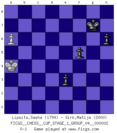 Last move : 0-1 2019 January 11 12:4:46 [Event "FICGS__CHESS__CUP_STAGE_1_GROUP_04__000002"] [Site "FICGS"] [Date "2018.07.02"] [Round "1"] [White "Lipsits,Sasha"] [Black "Sirk,Matija"] [Result "0-1"] [WhiteElo "1794"] [BlackElo "2000"] 1.e4 c6 2.d4 d5 3.Nc3 dxe4 4.Nxe4 Bf5 5.Ng3 Bg6 6.Nf3 Nd7 7.h4 h6 8.h5 Bh7 9.Bd3 Bxd3 10.Qxd3 e6 11.Bf4 Qa5+ 12.Bd2 Bb4 13.Ne4 Ngf6 14.Bxb4 Qxb4+ 15.Nc3 Qxb2 16.Rb1 Qa3 17.Rxb7 O-O 18.O-O Rfb8 19.Rfb1 Rxb7 20.Rxb7 Rd8 21.Rb3 Qc1+ 22.Qd1 Qf4 23.g3 Qf5 24.Ra3 a5 25.Qe2 Qxh5 26.Kg2 Rb8 27.Ne5 Qxe2 28.Nxe2 Rb2 29.Rxa5 g5 30.Ra7 Nxe5 31.dxe5 Ng4 32.f4 gxf4 33.Kf3 Nxe5+ 34.Kxf4 Ng6+ 35.Ke4 Rxc2 36.Kd3 Rb2 37.Nc3 Rg2 38.Ne2 Ne5+ 39.Ke3 Ng4+ 40.Kd3 Rf2 41.a4 Rf3+ 42.Kc4 Re3 43.Nc3 Rxg3 44.a5 Ne3+ 45.Kd4 Nc2+ 46.Kc4 Rg4+ 47.Kc5 Ne3 48.Ne2 Rc4+ 49.Kd6 Nf5+ 50.Kc7 Rc2 51.Ng1 Nd4 52.Ra8+ Kg7 53.a6 e5 54.Re8 Ne6+ 55.Kb6 Rb2+ 56.Kxc6 Ra2 57.Ra8 e4 58.Kb6 Rb2+ 59.Ka5 Nd4 60.Rc8 Rb5+ 61.Ka4 Rb1 62.Rc4 Rxg1 63.Rxd4 f5 64.Kb3 Ra1 65.Ra4 Rxa4 66.Kxa4 e3 0-1 Caro-Kann : Classical variation Kingside Castling by player Black (move 17) Kingside Castling by player White (move 18) 10 pieces endgame at move 56 : White KRNP , Black KRNPPP WHITE : King + 1 Rook 1 Knight 1 Pawn BLACK : King + 1 Rook 1 Knight 3 Pawns 9 pieces endgame at move 62 : White KRP , Black KRNPPP WHITE : King + 1 Rook 1 Pawn BLACK : King + 1 Rook 1 Knight 3 Pawns 8 pieces endgame at move 63 : White KRP , Black KRPPP WHITE : King + 1 Rook 1 Pawn BLACK : King + 1 Rook 3 Pawns 7 pieces endgame at move 65 : White KP , Black KRPPP WHITE : King + 1 Pawn BLACK : King + 1 Rook 3 Pawns 6 pieces endgame at move 66 : White KP , Black KPPP WHITE : King + 1 Pawn BLACK : King + 3 Pawns Player Black won this chess game. Follow this game move after move (download)Fischer sacrificed virtually everything most of us weakies (to use his term) value, respect, and cherish, for the sake of an artful, often beautiful board game, for the ambivalent privilege of being its greatest master. (Paul Kollar) Es ist im Leben wie im Schachspiel. Wir entwerfen einen Plan, dieser bleibt jedoch bedingt durch das, was im Schachspiel dem Gegner, im Leben dem Schicksal zu tun belieben wird. (Arthur Schopenhauer) El juego de Damas es para vagabundos. (Paul Morphy) Tous ces prétendus hommes politiques sont les pions, les Cavaliers, les Tours ou les Fous d'une partie d'échecs qui se jouera tant qu'un hasard ne renversera pas l'échiquier. (Honoré de Balzac) Being number two sucks. (Andre Agassi)