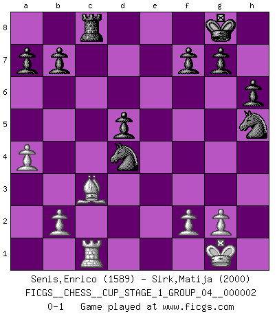 Last move : 0-1 2018 October 7 23:48:56 [Event "FICGS__CHESS__CUP_STAGE_1_GROUP_04__000002"] [Site "FICGS"] [Date "2018.07.02"] [Round "1"] [White "Senis,Enrico"] [Black "Sirk,Matija"] [Result "0-1"] [WhiteElo "1589"] [BlackElo "2000"] 1.e4 c6 2.d4 d5 3.Nc3 dxe4 4.Nxe4 Bf5 5.Ng3 Bg6 6.Nf3 Nd7 7.h4 h6 8.h5 Bh7 9.Bd3 Bxd3 10.Qxd3 e6 11.Bf4 Qa5+ 12.c3 Ngf6 13.a4 Nd5 14.Bd2 Qc7 15.O-O N5f6 16.Rfe1 Bd6 17.Nf5 O-O 18.Nxd6 Qxd6 19.Qe3 c5 20.Ne5 cxd4 21.cxd4 Rfd8 22.Bc3 Rac8 23.Rac1 Qd5 24.Qe2 Nb8 25.Red1 Nc6 26.Qf3 Qxf3 27.Nxf3 Nxh5 28.d5 Rxd5 29.Rxd5 exd5 30.Nd4 Nxd4 0-1 Caro-Kann : Classical variation Kingside Castling by player White (move 15) Kingside Castling by player Black (move 17) Player Black won this chess game. Follow this game move after move (download)The chessboard is the world, the pieces are the phenomena of the Universe, the rules of the game are what we call the laws of Nature and the player on the other side is hidden from us. (Thomas Huxley) Ich kenne keine einzige Person, die behaupten würde, Garri Kasparow sei ein guter Mensch (Nigel Short) Cuando tengo las piezas blancas, yo gano porque soy blanco; Cuando tengo las piezas negras, yo gano porque soy Bogolyubov. (Bogolyubov) Les pièces de l'échiquier étaient impitoyables. Elles le retenaient, elles l'absorbaient. Il y avait de l'horreur en cela, mais aussi une harmonie unique. Car, qu'y a-t-il dans le monde, à part les échecs ? (V. Nabokov) Philosophers use a language that is already deformed as though by shoes that are too tight. (Ludwig Wittgenstein)