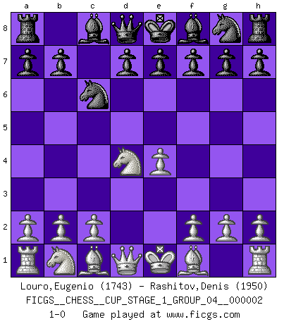 Last move : 1-0 2018 August 8 9:52:43 [Event "FICGS__CHESS__CUP_STAGE_1_GROUP_04__000002"] [Site "FICGS"] [Date "2018.07.02"] [Round "1"] [White "Louro,Eugenio"] [Black "Rashitov,Denis"] [Result "1-0"] [WhiteElo "1743"] [BlackElo "1950"] 1.e4 c5 2.Nf3 Nc6 3.d4 cxd4 4.Nxd4 1-0 This chess game has been lost on time (started : 2018.07.02 2:46:11) Sicilian defense Player White won this chess game. Follow this game move after move (download)Chess is mental torture. (Garry Kasparov) Ohne Leiden bildet sich kein Charakter. (Ernst Freiherr von Feuchtersleben) El Ajedrez hace al hombre ser mas sabio y ver mas claro. (Vladimir Putin) Des points faibles ou des trous dans la position de l'adversaire doivent être occupés par des pièces et non pas par des pions. (Siegbert Tarrasch) Memory is a crazy woman that hoards colored rags and throws away food. (Austin O'Malley)