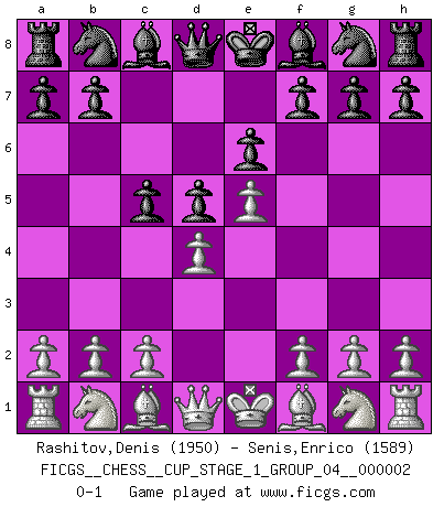 Last move : 0-1 2018 August 5 21:30:58 [Event "FICGS__CHESS__CUP_STAGE_1_GROUP_04__000002"] [Site "FICGS"] [Date "2018.07.02"] [Round "1"] [White "Rashitov,Denis"] [Black "Senis,Enrico"] [Result "0-1"] [WhiteElo "1950"] [BlackElo "1589"] 1.e4 e6 2.d4 d5 3.e5 c5 0-1 This chess game has been lost on time (started : 2018.07.02 2:46:11) French : Advance variation Player Black won this chess game. Follow this game move after move (download)In the perfect Chess combination as in a first-rate short story, the whole plot and counter-plot should lead up to a striking finale, the interest not being allayed until the very last moment. (Yates and Winter) Ich bewundere Kasparows phantasievolle Angriffssiege aus den Achtzigern und Neunzigern, aber wenn man sie mit dem Computer überprüft, nimmt der Computer in jeder zweiten Partie die Opfer an, verteidigt sich und gewinnt. (Vladimir Kramnik) Muchos jugadores de Ajedrez se sorprendían cuando después de la partida, Fischer explicaba con calma: 'Yo ya había analizado esta posibilidad' en una posición en la cual yo creía que no era posible de prever desde la apertura. (Mikhail Tal) Un journaliste : 'Vous préférez avoir une dame de plus sur l'échiquier ou au lit ?' Boris Spassky : 'Ca dépend de la position.' All the troubles of the world come from being unable to sit alone in a quiet room. (Blaise Pascal)