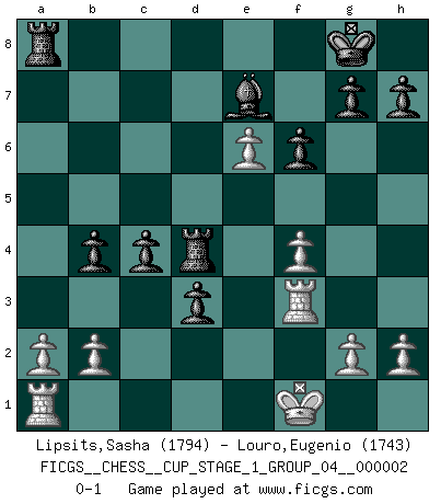 Last move : 0-1 2018 September 3 15:6:0 [Event "FICGS__CHESS__CUP_STAGE_1_GROUP_04__000002"] [Site "FICGS"] [Date "2018.07.02"] [Round "1"] [White "Lipsits,Sasha"] [Black "Louro,Eugenio"] [Result "0-1"] [WhiteElo "1794"] [BlackElo "1743"] 1.d4 Nf6 2.Nf3 d5 3.c4 c6 4.e3 Bg4 5.Qb3 Qb6 6.Ne5 Bf5 7.Qxb6 axb6 8.cxd5 Nxd5 9.Bd2 e6 10.Bd3 Bxd3 11.Nxd3 Be7 12.e4 Nf6 13.Nc3 O-O 14.e5 Nd5 15.Nxd5 exd5 16.Bb4 c5 17.dxc5 Na6 18.O-O Nxb4 19.Nxb4 Rfd8 20.Rfd1 d4 21.Nc2 bxc5 22.Rd3 f6 23.f4 c4 24.Rf3 b5 25.e6 b4 26.Kf1 d3 27.Nd4 Rxd4 0-1 Queen's pawn game Kingside Castling by player Black (move 13) Kingside Castling by player White (move 18) Player Black won this chess game. Follow this game move after move (download)Botvinnik tried to take the mystery out of Chess, always relating it to situations in ordinary life. He used to call Chess a typical inexact problem similar to those which people are always having to solve in everyday life. (Garry Kasparov) Über Karpov: Er war und ist ein Vertreter der russischen Reaktionäre. Das steckt tief in seiner Seele, wehalb ich nicht nett mit ihm umgehen kann. (Viktor Kortschnoi) La enorme capacidad mental, en la que sin ella no puede un jugador de Ajedrez existir, es demasiado requerida por el Ajedrez al grado de que nunca podrá liberar su mente de este juego. (Albert Einstein) La vie et les Echecs sont tous les deux une lutte constante. (Lasker) I find your interest interesting. (Gregory House, House M.D.)