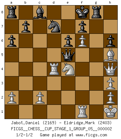 Last move : 1/2-1/2 2018 August 18 19:38:8 [Event "FICGS__CHESS__CUP_STAGE_1_GROUP_05__000002"] [Site "FICGS"] [Date "2018.07.02"] [Round "1"] [White "Jabot,Daniel"] [Black "Eldridge,Mark"] [Result "1/2-1/2"] [WhiteElo "2169"] [BlackElo "2403"] 1.e4 c5 2.Nf3 d6 3.d4 cxd4 4.Nxd4 Nf6 5.Nc3 a6 6.Bg5 e6 7.f4 Qb6 8.Qd2 Qxb2 9.Rb1 Qa3 10.e5 h6 11.Bh4 dxe5 12.fxe5 g5 13.exf6 gxh4 14.Be2 Qa5 15.O-O Nd7 16.Kh1 Qg5 17.Qe1 h3 18.gxh3 Qe5 19.Qf2 Rg8 20.Rbe1 Bc5 21.Rd1 Kf8 22.Qh4 Rg6 23.Ne4 Bxd4 24.Bh5 Rg8 25.Rxd4 1/2-1/2 Sicilian : Najdorf, 7...Qb6 Kingside Castling by player White (move 15) This chess game ended in a draw. Follow this game move after move (download)Chess is as much a mystery as women. (Purdy) Modernes Schach erfordert enorme Anspannung. Es ist für einen normalen Menschen unmöglich das auszuhalten. (Viktor Kortschnoi) El Ajedrez es una hermosa aventura. (Bent Larsen) En blitz, le Cavalier l'emporte sur le Fou. (Vlastimil Hort) Success without honor is an unseasoned dish; it will satisfy your hunger, but it won't taste good. (Joe Paterno)