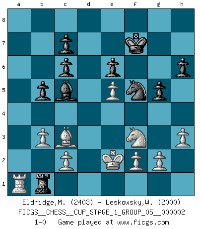 Last move : 1-0 2018 October 4 18:54:59 [Event "FICGS__CHESS__CUP_STAGE_1_GROUP_05__000002"] [Site "FICGS"] [Date "2018.07.02"] [Round "1"] [White "Eldridge,Mark"] [Black "Leskowsky,Wandrille"] [Result "1-0"] [WhiteElo "2403"] [BlackElo "2000"] 1.e4 e5 2.Nf3 Nc6 3.Bb5 Nf6 4.O-O Nxe4 5.d4 Nd6 6.Bxc6 dxc6 7.dxe5 Nf5 8.Qxd8+ Kxd8 9.Nc3 Ke8 10.b3 a5 11.Rd1 Bb4 12.Ne4 a4 13.Rb1 axb3 14.axb3 Be6 15.Neg5 h6 16.Nxe6 fxe6 17.Bb2 g5 18.h3 Rh7 19.Ra1 Rxa1 20.Rxa1 Rd7 21.Kf1 b6 22.Ra8+ Kf7 23.Ra4 Rd1+ 24.Ke2 Rb1 25.Ra2 Bc5 26.Bc3 b5 27.Ra1 1-0 This chess game has been lost on time (started : 2018.07.02 2:46:13) Ruy Lopez : Berlin defense, Open variation Kingside Castling by player White (move 4) Player White won this chess game. Follow this game move after move (download)We like to think. (Gary Kasparov) Schach ist das schnellste Spiel der Welt, weil man in jeder Sekunde Tausende von Gedanken ordnen muß. (Albert Einstein) Muchos se han convertido en Maestros de Ajedrez, nadie se ha convertido en el Maestro del Ajedrez. (Siegbert Tarrasch) C'est une question de caractère, Beaucoup de gens perdent leur motivation très vite. D'autres, ils sont rares, peuvent la conserver très longtemps. J'aime les échecs, encore aujourd'hui je suis heureux d'analyser des parties. J'aime toujours gagner, je déteste encore perdre. Bien jouer est important pour mon intégrité intellectuelle et morale. Et puis les échecs vivent en ce moment une période historique grâce à Internet. Ils se développent dans les systèmes éducatifs à travers le monde. Ils sortent de leur ghetto, et c'est mon rôle de mener à bien cette révolution. (Gary Kasparov) Man with more than one clock never knows what time it is. (Chinese thought)