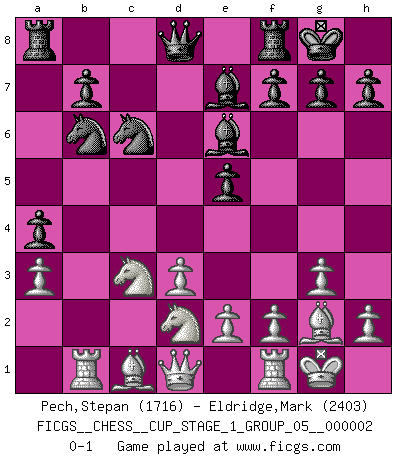 Last move : 0-1 2018 September 2 9:30:20 [Event "FICGS__CHESS__CUP_STAGE_1_GROUP_05__000002"] [Site "FICGS"] [Date "2018.07.02"] [Round "1"] [White "Pech,Stepan"] [Black "Eldridge,Mark"] [Result "0-1"] [WhiteElo "1716"] [BlackElo "2403"] 1.c4 e5 2.Nc3 Nf6 3.Nf3 Nc6 4.g3 d5 5.cxd5 Nxd5 6.Bg2 Nb6 7.O-O Be7 8.d3 O-O 9.a3 Be6 10.b4 a5 11.b5 Nd4 12.Nd2 c6 13.bxc6 Nxc6 14.Rb1 a4 0-1 English Opening Kingside Castling by player White (move 7) Kingside Castling by player Black (move 8) Player Black won this chess game. Follow this game move after move (download)I look one move ahead... the best ! (Siegbert Tarrasch) Lisa Lane, amerikanische Schachmeisterin, hatte Fischer einmal als stärksten lebenden Spieler bezeichnet. Antwort: Das ist richtig, aber Lisa Lane ist eigentlich nicht in der Lage, das zu beurteilen. (Robert James Fischer) Un entendimiento a fondo de las continuaciones tÃpicas del mate, hace de las combinaciones de sacrificio mas complicadas conducirlas a ellas no solo sin dificultad, sino casi de una manera natural. (Siegbert Tarrasch) Roi des jeux et jeu des rois, les échecs portent en eux un sentiment d'infini. Ils donnent à celui qui s'est efforcé d'en approfondir les arcanes l'impression de n'être pas à la mesure de l'homme; en fait, ils constituent un résumé de l'univers, un microcosme, et figurent cette grande échelle qui, dans les plans de la lumière descend jusqu'à la matière, qui des abîmes insondables remonte jusqu'en l'infini de Dieu. (Pyrame) Perfection is achieved, not when there is nothing more to add, but when there is nothing left to take away. (Antoine de Saint-Exupéry)