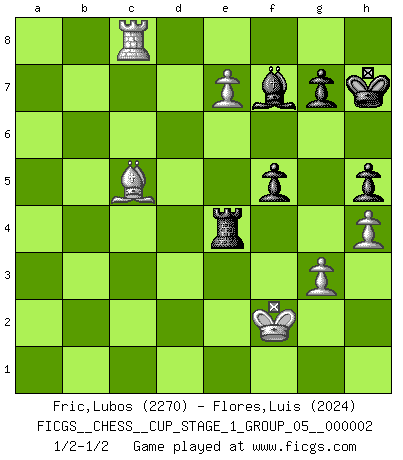 Last move : 1/2-1/2 2018 November 22 23:4:24 [Event "FICGS__CHESS__CUP_STAGE_1_GROUP_05__000002"] [Site "FICGS"] [Date "2018.07.02"] [Round "1"] [White "Fric,Lubos"] [Black "Flores,Luis"] [Result "1/2-1/2"] [WhiteElo "2270"] [BlackElo "2024"] 1.Nf3 Nf6 2.g3 d5 3.Bg2 e6 4.O-O Be7 5.c4 O-O 6.d4 dxc4 7.Ne5 Nc6 8.Bxc6 bxc6 9.Nxc6 Qe8 10.Nxe7+ Qxe7 11.Qc2 c5 12.Qxc4 cxd4 13.Qxd4 e5 14.Qh4 Rb8 15.b3 Qe6 16.Bb2 Nd5 17.Qe4 f6 18.Nc3 Nxc3 19.Bxc3 Bb7 20.Qe3 Ra8 21.f3 a5 22.Rfc1 Rfc8 23.Be1 e4 24.Rxc8+ Rxc8 25.Rd1 h6 26.fxe4 Rc2 27.Rd2 Rc8 28.Rd4 Rc2 29.Qd3 Rxa2 30.Rd8+ Kh7 31.e5 f5 32.Bc3 Be4 33.Qc4 Qb6+ 34.Qd4 Qxd4+ 35.Rxd4 Rxe2 36.Rd7 Re3 37.Rc7 Bd5 38.e6 h5 39.e7 Kg6 40.b4 axb4 41.Bxb4 Bf7 42.Rc8 Kf6 43.Bc5 Re4 44.h4 Kg6 45.Kf2 Rc4 46.Kf3 Bd5+ 47.Ke2 Bf7 48.Rc6+ Kh7 49.Rc8 Re4+ 50.Kf3 Kg6 51.Rc6+ Kh7 52.Rc8 Kg6 53.Bd6 Bd5 54.Kf2 Bf7 55.Rf8 Kf6 56.Ba3 Re6 57.Rb8 Re4 58.Bc5 Re6 59.Rh8 Re4 60.Rf8 Kg6 61.Rd8 Kf6 62.Rc8 Kg6 63.Rc6+ Kh7 64.Rc8 1/2-1/2 Reti Opening Kingside Castling by player White (move 4) Kingside Castling by player Black (move 5) This chess game ended in a draw. Follow this game move after move (download)That's what Chess is all about. One day you give your opponent a lesson, the next day he gives you one. (Bobby Fischer) Schach ist Krieg, im Schach geht es um testosterongesteuerte Urschreie. (Garry Kasparov) La vida es como un juego de Ajedrez, cambiando con cada movimiento. (Proverbio Chino) Les Echecs sont affaire de jugement sensible. Savoir quand frapper et quand esquiver. (Fischer) Panic is a sudden desertion of us, an a going over to the enemy of our imagination. (Christian Nevell Bovee)