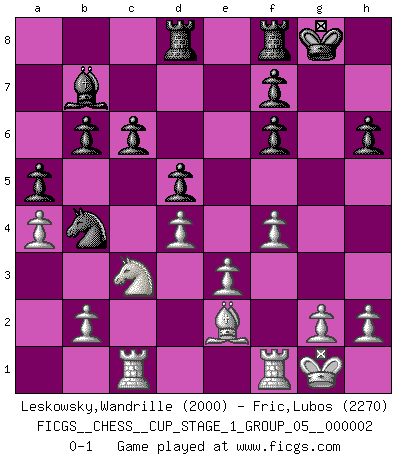 Last move : 0-1 2018 October 10 19:29:7 [Event "FICGS__CHESS__CUP_STAGE_1_GROUP_05__000002"] [Site "FICGS"] [Date "2018.07.02"] [Round "1"] [White "Leskowsky,Wandrille"] [Black "Fric,Lubos"] [Result "0-1"] [WhiteElo "2000"] [BlackElo "2270"] 1.d4 Nf6 2.c4 c6 3.Nf3 d5 4.Nc3 e6 5.Bg5 h6 6.Bh4 Be7 7.e3 a6 8.a4 a5 9.Be2 Na6 10.O-O O-O 11.Ne5 Nd7 12.Bxe7 Qxe7 13.f4 Nb4 14.Rc1 b6 15.Qe1 Bb7 16.Qg3 Rad8 17.cxd5 exd5 18.Ng4 Qd6 19.Qh4 Nf6 20.Nxf6+ Qxf6 21.Qxf6 gxf6 0-1 This chess game has been lost on time (started : 2018.07.02 2:46:13) Queen's pawn game Kingside Castling by player White (move 10) Kingside Castling by player Black (move 10) Player Black won this chess game. Follow this game move after move (download)A chess genius has died; a loss for humanity. (Viktor Kortchnoi, about Bobby Fischer's death) Mein Gehirn das ist mein zweitwichtigstes Organ [Aus dem Film: Der Schläfer]. (Woody Allen) No nos podemos resistir a la fascinación de un sacrificio ya que la pasión por los sacrificios es parte de la naturaleza de un jugador de Ajedrez. (Rudolf Spielman) Toutes les manuvres exécutées sur une colonne ouverte ont pour but ultime l'intrusion définitive sur la septième ou la huitième rangée, en plein cur de la position ennemie. (Aaron Nimzovitch) The Movers & Shakers of this world are those who play chess in the mornings and go to the disco in the evenings. (Dinesh De Silva)