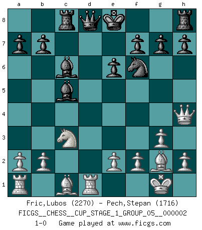 Last move : 1-0 2018 September 23 3:5:11 [Event "FICGS__CHESS__CUP_STAGE_1_GROUP_05__000002"] [Site "FICGS"] [Date "2018.07.02"] [Round "1"] [White "Fric,Lubos"] [Black "Pech,Stepan"] [Result "1-0"] [WhiteElo "2270"] [BlackElo "1716"] 1.Nf3 Nf6 2.g3 d5 3.Bg2 c5 4.O-O Nc6 5.d4 e6 6.c4 dxc4 7.Qa4 Bd7 8.Qxc4 cxd4 9.Nxd4 Rc8 10.Nc3 Nxd4 11.Qxd4 Bc5 12.Qh4 Bc6 13.Rd1 1-0 This chess game has been lost on time (started : 2018.07.02 2:46:13) Reti Opening Kingside Castling by player White (move 4) Player White won this chess game. Follow this game move after move (download)The tactician knows what to do when there is something to do; whereas the strategian knows what to do when there is nothing to do. (Gerald Abrahams) Es gibt keine einzige Frau, der ich nicht einen Springer vorgeben könnte und trotzdem gewänne. (Robert James Fischer) El Ajedrez es una hermosa aventura. (Bent Larsen) Les Cavaliers se révèlent fort utiles dans les positions fermées. D'habitude, les Fous sont un peu plus forts que les Cavaliers dans les positions ouvertes. Qu'on le veuille ou non, il restera toujours des exceptions ! Heh, heh, heh. Time to abandon ship. (General Grievous in Star Wars ep.3)