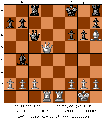Last move : 1-0 2018 July 15 11:4:54 [Event "FICGS__CHESS__CUP_STAGE_1_GROUP_05__000002"] [Site "FICGS"] [Date "2018.07.02"] [Round "1"] [White "Fric,Lubos"] [Black "Cirovic,Zeljko"] [Result "1-0"] [WhiteElo "2270"] [BlackElo "1348"] 1.e4 c5 2.Nf3 e6 3.Nc3 d5 4.Bb5+ Nc6 5.exd5 exd5 6.d4 c4 7.Ne5 Bd7 8.Qh5 g6 9.Qe2 Nxe5 10.Bf4 Be7 11.Qxe5 f6 12.Qxd5 Bxb5 13.Qxb5+ Qd7 14.Qxc4 Rc8 15.Qe2 Qxd4 16.Qf3 Bb4 17.O-O Ne7 18.Rad1 Qb6 19.Nd5 Nxd5 20.Qxd5 Qc6 21.Rfe1+ Kf8 22.Bh6+ 1-0 Sicilian defense Kingside Castling by player White (move 17) Player White won this chess game. Follow this game move after move (download)I love all positions. Give me a difficult positional game, I will play it. But totally won positions, I cannot stand them. (Hein Donner) Kasparov stellt für gewöhnlich die Regeln auf und bricht sie dann selbst wieder. (Alexej Shirov) El Ajedrez es en su esencia, un juego. En su forma, un arte. Y en su ejecución, una ciencia. (Baron Tassilo) Botvinnik disait en comparant les échecs à la musique: Il existe une science dont le but est l'étude de l'acoustique et des sons. Mais il y a aussi un art qui se sert de l'océan des sons : c'est la musique. De toute évidence, il en est de même pour la pensée. La logique est l'étude des lois de la réflexion et les échecs reflètent, en tant qu'art, le côté logique de la réflexion, sous la forme d'images artistiques... Extrait de Fischer - Spassky, Reykjavik 1972 par Alexander & F. Wyndham (Ed. Solar), p 37. Somewhere in the world there is an epigram for every dilemma. (Hendrik Willem van Loon)