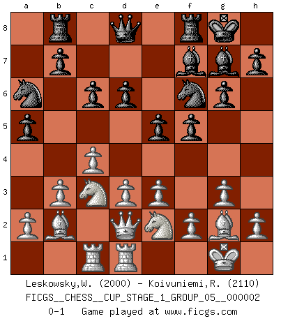 Last move : 0-1 2018 October 18 9:22:23 [Event "FICGS__CHESS__CUP_STAGE_1_GROUP_05__000002"] [Site "FICGS"] [Date "2018.07.02"] [Round "1"] [White "Leskowsky,Wandrille"] [Black "Koivuniemi,Raimo"] [Result "0-1"] [WhiteElo "2000"] [BlackElo "2110"] 1.c4 e5 2.Nc3 f5 3.g3 Nf6 4.Bg2 d6 5.d3 a5 6.e3 c6 7.Nge2 g6 8.O-O Bg7 9.b3 Na6 10.Bb2 O-O 11.Qd2 Be6 12.Rac1 Bf7 13.Rfd1 Rb8 0-1 This chess game has been lost on time (started : 2018.07.02 2:46:13) English Opening Kingside Castling by player White (move 8) Kingside Castling by player Black (move 10) Player Black won this chess game. Follow this game move after move (download)Chess is a terrible game. If you have no center, your opponent has a freer position. If you do have a center, then you really have something to worry about ! (Siegbert Tarrasch) Kleine Schachspieler machen Mist, und große Schachspieler machen Mist, aber große machen weniger Mist. (Fritz Sämisch) La maestría del Ajedrez consiste esencialmente en analizar posiciónes de Ajedrez con precisión. (Mikhail Botvinnik) Les pièces de l'échiquier étaient impitoyables. Elles le retenaient, elles l'absorbaient. Il y avait de l'horreur en cela, mais aussi une harmonie unique. Car, qu'y a-t-il dans le monde, à part les échecs ? (V. Nabokov) There is no instance of a country having benefited from prolonged warfare. (Sun Tzu)